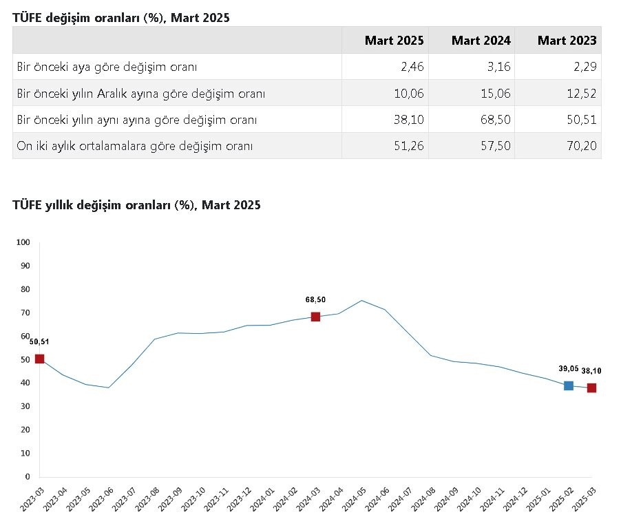 Caner ÜNVER/ANKARA, (DHA)- TÜRKİYE İstatistik Kurumu (TÜİK), mart ayında tüketici enflasyonunun aylık yüzde 2,46, yıllık yüzde 38,10 olduğunu açıkladı.TÜİK, Mart 2025 dönemine ilişkin enflasyon verilerini açıkladı. Buna göre; tüketici fiyatları bir önceki aya göre yüzde 2,46, bir önceki yılın aralık ayına göre yüzde 10,06, bir önceki yılın aynı ayına göre yüzde 38,10 ve 12 aylık ortalamalara göre yüzde 51,26 arttı.Tüketici enflasyonunda en yüksek ağırlığa sahip 3 ana harcama grubunun yıllık değişimleri; gıda ve alkolsüz içeceklerde yüzde 37,12 artış, ulaştırmada yüzde 21,59 artış ve konutta yüzde 68,63 artış olarak gerçekleşti. İlgili ana grupların yıllık değişime olan etkileri ise gıda ve alkolsüz içeceklerde yüzde 9,51, ulaştırmada yüzde 3,65 ve konutta yüzde 9,47 oldu. En yüksek ağırlığa sahip 3 ana harcama grubunun aylık değişimleri; gıda ve alkolsüz içeceklerde yüzde 4,94 artış, ulaştırmada yüzde 0,25 artış ve konutta yüzde 2,10 artış olarak gerçekleşti. İlgili ana grupların aylık değişime olan etkileri ise gıda ve alkolsüz içeceklerde yüzde 1,23, ulaştırmada yüzde 0,04 ve konutta yüzde 0,33 oldu.Endekste kapsanan 143 temel başlıktan 25 temel başlığın endeksinde düşüş gerçekleşirken, 5 temel başlığın endeksinde değişim olmadı. 113 temel başlığın endeksinde ise artış gerçekleşti.YILLIK ÜRETİCİ ENFLASYONU YÜZDE 23,50Yurt içi üretici fiyatları ise mart ayında bir önceki aya göre yüzde 1,88, bir önceki yılın aralık ayına göre yüzde 7,23, bir önceki yılın aynı ayına göre yüzde 23,50 ve 12 aylık ortalamalara göre yüzde 35,23 arttı. (DHA)