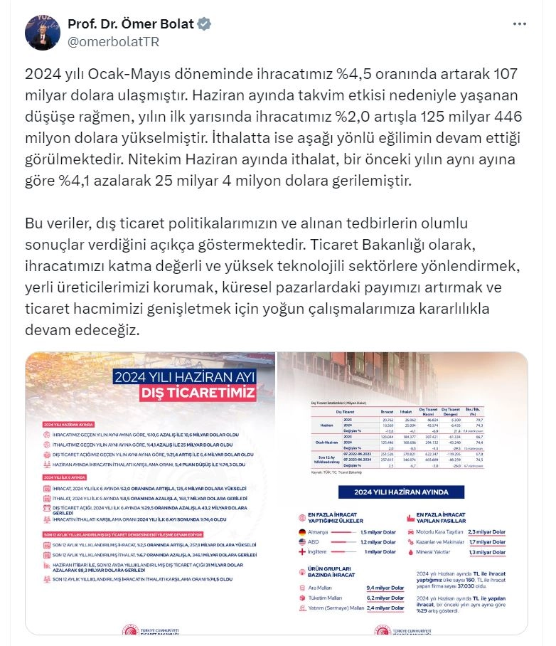 ANKARA, (DHA)- TİCARET Bakanı Ömer Bolat, "Haziran ayında takvim etkisi nedeniyle yaşanan düşüşe rağmen, yılın ilk yarısında ihracatımız yüzde 2 artışla 125 milyar 446 milyon dolara yükselmiştir" dedi.Ticaret Bakanı Ömer Bolat, 2024 Haziran ayı dış ticaret verilerine ilişkin sosyal medya hesabından açıklamada bulundu. Bolat, "2024 yılı ocak-mayıs döneminde ihracatımız yüzde 4,5 oranında artarak 107 milyar dolara ulaşmıştır. Haziran ayında takvim etkisi nedeniyle yaşanan düşüşe rağmen, yılın ilk yarısında ihracatımız yüzde 2 artışla 125 milyar 446 milyon dolara yükselmiştir. İthalatta ise aşağı yönlü eğilimin devam ettiği görülmektedir. Nitekim haziran ayında ithalat, bir önceki yılın aynı ayına göre yüzde 4,1 azalarak 25 milyar 4 milyon dolara gerilemiştir. Bu veriler, dış ticaret politikalarımızın ve alınan tedbirlerin olumlu sonuçlar verdiğini açıkça göstermektedir. Ticaret Bakanlığı olarak, ihracatımızı katma değerli ve yüksek teknolojili sektörlere yönlendirmek, yerli üreticilerimizi korumak, küresel pazarlardaki payımızı artırmak ve ticaret hacmimizi genişletmek için yoğun çalışmalarımıza kararlılıkla devam edeceğiz" dedi.'HAZİRANDA İHRACAT, YÜZDE 10,6 ORANINDA DÜŞTÜ'Öte yandan bakanlıktan yapılan açıklamada, haziran ayında takvim etkisi nedeniyle ihracatta geçici bir düşüş yaşandığı belirtilerek, "2024 yılı haziran ayında 9 günlük bayram tatili yanında, ihracatın düşük gerçekleştiği 5 adet hafta sonu (cumartesi-pazar) bulunurken, bayram haftası hariç ihracatın hafta içi en yüksek yapıldığı (perşembe ve cuma) iki iş gününün eksik olması, negatif takvim etkisi olarak ortaya çıkmıştır. Böylelikle, 2024 yılı haziran ayında ihracatımız yüzde 10,6 düşüşle 18 milyar 569 milyon dolar olarak gerçekleşmiştir. 2024 Haziran ayında dış ticaret açığı bir önceki yılın aynı ayına göre, yüzde 21,4 oranında artışla 6 milyar 434 milyon dolar olmuştur. Bu değer, son 5 ayın en düşük aylık dış ticaret açığıdır. İhracatın ithalatı karşılama oranı ise haziran ayında bir önceki yılın aynı ayına göre 5,4 yüzde puan azalışla yüzde 74,3 olarak gerçekleşmiştir" denildi. (DHA)