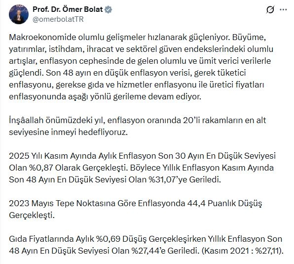 Ticaret Bakanı Ömer Bolat, kasım ayı enflasyon verilerine ilişkin sosyal medya hesabından açıklama yaptı. Bakan Bolat, "Makroekonomide olumlu gelişmeler hızlanarak güçleniyor. Büyüme, yatırımlar, istihdam, ihracat ve sektörel güven endekslerindeki olumlu artışlar, enflasyon cephesinde de gelen olumlu ve ümit verici verilerle güçlendi. Son 48 ayın en düşük enflasyon verisi gerek tüketici enflasyonu gerekse gıda ve hizmetler enflasyonu ile üretici fiyatları enflasyonunda aşağı yönlü gerileme devam ediyor. İnşallah önümüzdeki yıl, enflasyon oranında 20'li rakamların en alt seviyesine inmeyi hedefliyoruz" ifadelerini kullandı.