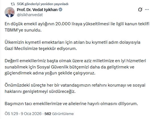 Bakan Işıkhan, sanal medya hesabından yaptığı açıklamada, "En düşük emekli aylığının 20 bin TL'ye yükseltilmesi ile ilgili kanun teklifi TBMM'ye sunuldu. Ülkemizin kıymetli emektarları için atılan bu kıymetli adım dolayısıyla Gazi Meclisimize teşekkür ediyorum. Değerli emeklilerimiz başta olmak üzere aziz milletimize en iyi hizmetleri sunabilmek için Sosyal Güvenlik bütçemizi daha da geliştirmek ve güçlendirmek adına yoğun şekilde çalışıyoruz. Önümüzdeki süreçte her bir vatandaşımızın refahını korumayı ve sosyal haklarını genişletmeyi sürdüreceğiz. Başımızın tacı emeklilerimize ve ailelerine hayırlı olmasını diliyorum" dedi. (DHA)