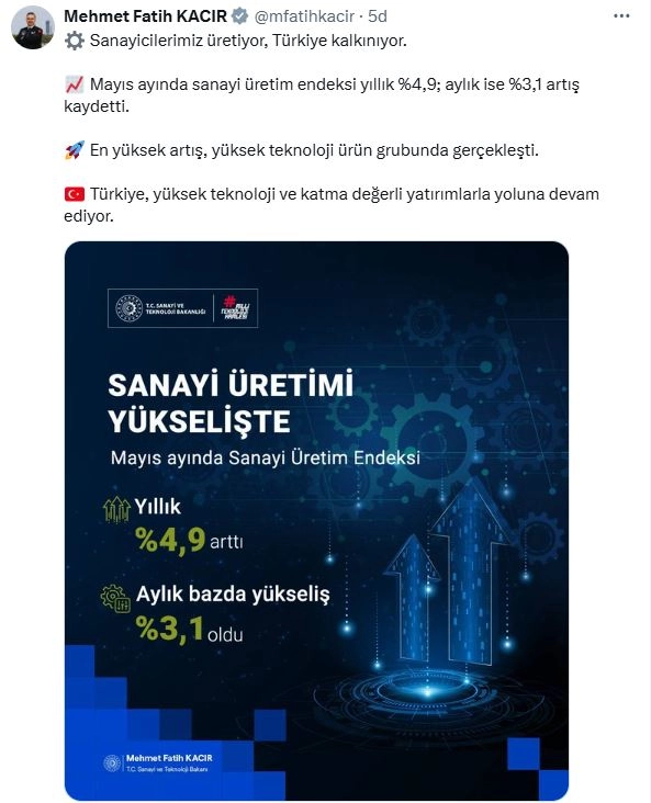 ANKARA, (DHA)- SANAYİ ve Teknoloji Bakanı Mehmet Fatih Kacır, "Sanayicilerimiz üretiyor, Türkiye kalkınıyor. Mayıs ayında sanayi üretim endeksi yıllık yüzde 4,9, aylık ise yüzde 3,1 artış kaydetti" dedi. Bakan Kacır, Türkiye İstatistik Kurumu'nun açıkladığı Nisan 2025 dönemi sanayi üretim endeksi verilerine ilişkin değerlendirmede bulundu. Kacır, sosyal medya hesabından yaptığı açıklamada, "Sanayicilerimiz üretiyor, Türkiye kalkınıyor. Mayıs ayında sanayi üretim endeksi yıllık yüzde 4,9, aylık ise yüzde 3,1 artış kaydetti. En yüksek artış, yüksek teknoloji ürün grubunda gerçekleşti. Türkiye, yüksek teknoloji ve katma değerli yatırımlarla yoluna devam ediyor" ifadelerini kullandı. (DHA)