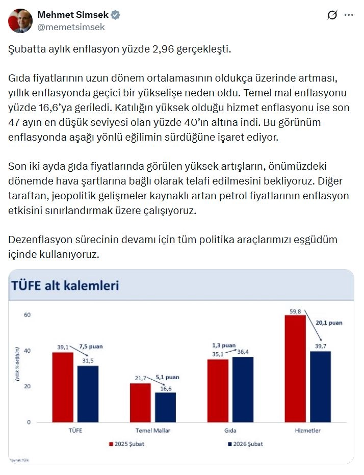 Hazine ve Maliye Bakanı Mehmet Şimşek, şubat ayı enflasyon verilerine ilişkin sanal medya hesabından açıklama yaptı. Bakan Şimşek, "Şubatta aylık enflasyon yüzde 2,96 gerçekleşti. Gıda fiyatlarının uzun dönem ortalamasının oldukça üzerinde artması, yıllık enflasyonda geçici bir yükselişe neden oldu. Temel mal enflasyonu yüzde 16,6’ya geriledi. Katılığın yüksek olduğu hizmet enflasyonu ise son 47 ayın en düşük seviyesi olan yüzde 40’ın altına indi. Bu görünüm enflasyonda aşağı yönlü eğilimin sürdüğüne işaret ediyor. Son iki ayda gıda fiyatlarında görülen yüksek artışların, önümüzdeki dönemde hava şartlarına bağlı olarak telafi edilmesini bekliyoruz. Diğer taraftan, jeopolitik gelişmeler kaynaklı artan petrol fiyatlarının enflasyon etkisini sınırlandırmak üzere çalışıyoruz. Dezenflasyon sürecinin devamı için tüm politika araçlarımızı eş güdüm içinde kullanıyoruz" ifadelerini kullandı. (DHA)