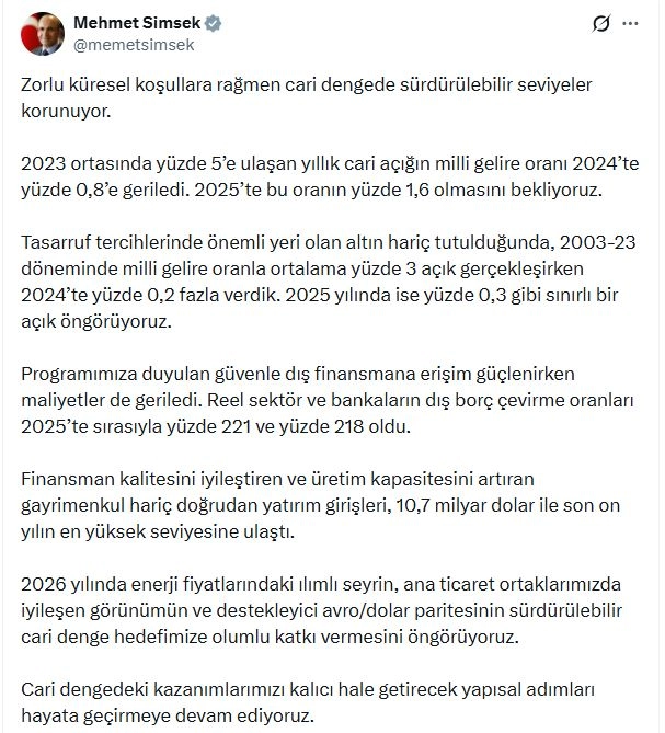 ANKARA, (DHA)- HAZİNE ve Maliye Bakan Mehmet Şimşek, "Zorlu küresel koşullara rağmen cari dengede sürdürülebilir seviyeler korunuyor" dedi.