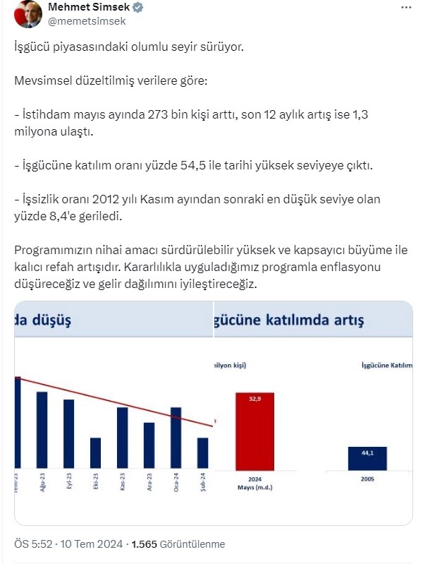 ANKARA, (DHA)- HAZİNE ve Maliye Bakanı Mehmet Şimşek, "Kararlılıkla uyguladığımız programla enflasyonu düşüreceğiz ve gelir dağılımını iyileştireceğiz" dedi.Bakan Şimşek, Türkiye İstatistik Kurumu'nun açıkladığı işsizlik verilerine ilişkin sosyal medya hesabından değerlendirmede bulundu. Şimşek, "İşgücü piyasasındaki olumlu seyir sürüyor. Mevsimsel düzeltilmiş verilere göre; istihdam mayıs ayında 273 bin kişi arttı, son 12 aylık artış ise 1,3 milyona ulaştı. İşgücüne katılım oranı yüzde 54,5 ile tarihi yüksek seviyeye çıktı. İşsizlik oranı 2012 yılı Kasım ayından sonraki en düşük seviye olan yüzde 8,4'e geriledi. Programımızın nihai amacı sürdürülebilir yüksek ve kapsayıcı büyüme ile kalıcı refah artışıdır. Kararlılıkla uyguladığımız programla enflasyonu düşüreceğiz ve gelir dağılımını iyileştireceğiz" ifadelerini kullandı. (DHA)