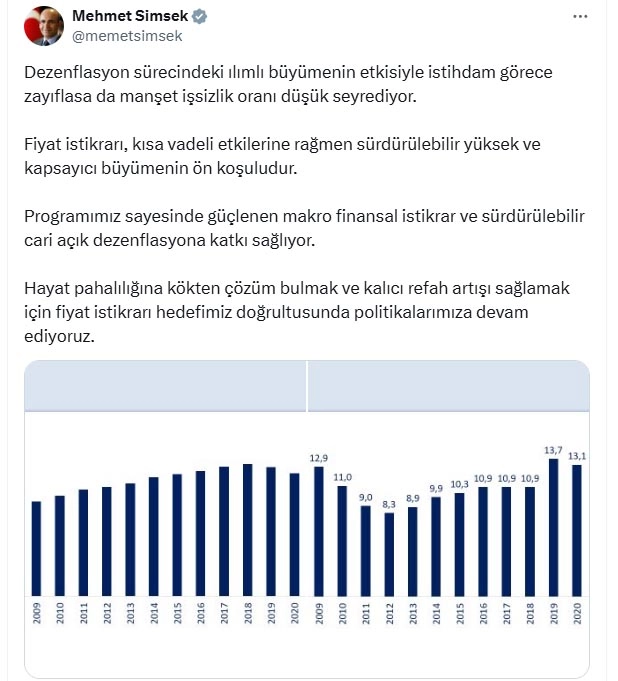 ANKARA, (DHA)- HAZİNE ve Maliye Bakanı Mehmet Şimşek, "Dezenflasyon sürecindeki ılımlı büyümenin etkisiyle istihdam görece zayıflasa da manşet işsizlik oranı düşük seyrediyor" dedi. Bakan Şimşek, sosyal medya hesabından işsizlik verilerine ilişkin yaptığı açıklamada, "Dezenflasyon sürecindeki ılımlı büyümenin etkisiyle istihdam görece zayıflasa da manşet işsizlik oranı düşük seyrediyor. Fiyat istikrarı, kısa vadeli etkilerine rağmen sürdürülebilir yüksek ve kapsayıcı büyümenin ön koşuludur. Programımız sayesinde güçlenen makro finansal istikrar ve sürdürülebilir cari açık dezenflasyona katkı sağlıyor. Hayat pahalılığına kökten çözüm bulmak ve kalıcı refah artışı sağlamak için fiyat istikrarı hedefimiz doğrultusunda politikalarımıza devam ediyoruz" ifadelerini kullandı. (DHA)