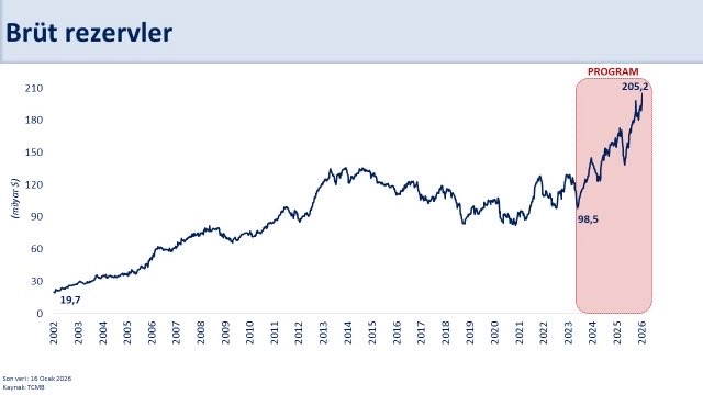 Hazine ve Maliye Bakanı Mehmet Şimşek, sanal medya hesabından yaptığı açıklamada, "Rezervlerimiz tarihi zirvesinde. Uyguladığımız program sayesinde brüt rezervler yaklaşık 107 milyar dolar artarak 205,2 milyar dolara ulaştı. Swap hariç net rezervlerdeki artış ise 139,3 milyar dolar oldu. Uluslararası standartlara göre rezerv yeterliliğini sağladık. Aynı zamanda, önemli bir koşullu yükümlülük olan 143 milyar dolar tutarındaki KKM’den çıkış sürecini de başarıyla tamamlıyoruz. Böylece döviz pozisyonunda toplam 280 milyar doları aşan iyileşme gerçekleşti. Güçlenen makro finansal istikrar, risk primimizin azalmasına ve ekonomimizin şoklara karşı daha dayanıklı hale gelmesine önemli katkı sağlıyor" ifadelerini kullandı. (DHA)