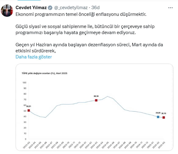 Aybala MELEK/ANKARA, (DHA)- CUMHURBAŞKANI Yardımcısı Cevdet Yılmaz, "Tek haneli oranlara ulaşıncaya kadar enflasyon ile kararlı mücadelemizi sürdüreceğiz" dedi.Cumhurbaşkanı Yardımcısı Cevdet Yılmaz, Türkiye İstatistik Kurumu'nun açıkladığı mart ayı enflasyon verilerine ilişkin, sosyal medya hesabından açıklama yaptı. Yılmaz, ekonomi programının temel önceliğinin enflasyonu düşürmek olduğunu belirterek, "Güçlü siyasi ve sosyal sahiplenme ile bütüncül bir çerçeveye sahip programımızı başarıyla hayata geçirmeye devam ediyoruz. Geçen yıl Haziran ayında başlayan dezenflasyon süreci, Mart ayında da etkisini sürdürerek, 10 aydır kesintisiz olarak devam ediyor. Tüketici enflasyonu mart ayında yıllık yüzde 38,1 seviyesine gerileyerek, dezenflasyonun başladığı 2024 yılı Haziran ayından bu yana 37,4 puanlık bir düşüş gösterdi. Aylık bazda enflasyonda 1,2 puanla en önemli paya sahip gıda fiyatlarında, ramazan ayının etkisi görülmektedir. Hizmet enflasyonundaki katılığın kırılması devam etmekte ve hizmet enflasyonu oranında düşüş sürmektedir. Yurt içi üretici fiyatlarının da artış hızının bir önceki aya göre azalması ve yıllık üretici enflasyonunun yüzde 23,5 seviyesine gerilemesi, tüketici fiyatları üzerindeki maliyet kaynaklı baskıların giderek hafiflediğini göstermektedir" dedi.'İSTİKRARLI BİR EKONOMİ İÇİN ÇALIŞMAYA DEVAM EDECEĞİZ'Enflasyonu düşürürken dengeli büyümeyi ve istihdam artışını amaçladıklarını ifade eden Yılmaz, "Enflasyonu düşürürken aynı zamanda yatırım ortamını iyileştiren, verimliliği artıran, üretken kapasiteyi genişleten, ihracat odaklı bir makroekonomik çerçeveyle dengeli büyümeyi ve istihdam artışını amaçlıyoruz. Beklentilerin sağlıklı yönetimi ve enflasyonla mücadelede başarılı olmak adına, para ve maliye politikalarımızı etkin şekilde koordine etmeye devam ediyoruz. Dönemsel gelişmeler kısa süreli olumlu veya olumsuz etkiler yapabilir. Aslolan ise programın ana çerçevesi ve istikametidir. Son dönemde görüldüğü üzere, kısa dönemli etkilere yönelik olarak kurumlarımız gerekli tedbirleri hızla alma kapasitesine sahiptir. Güçlü ve istikrarlı bir ekonomi, kapsayıcı sosyal politikalar için koordinasyon içinde ve tüm paydaşlarla istişare ve iş birliğiyle çalışmaya devam edeceğiz. Enflasyonun çok daha düşük oranlara gerilediği bir ortamda; istikrar içinde büyümeyi ve sosyal refahı artırmayı hedefliyoruz. Tek haneli oranlara ulaşıncaya kadar enflasyon ile kararlı mücadelemizi sürdüreceğiz" ifadelerini kullandı. (DHA)