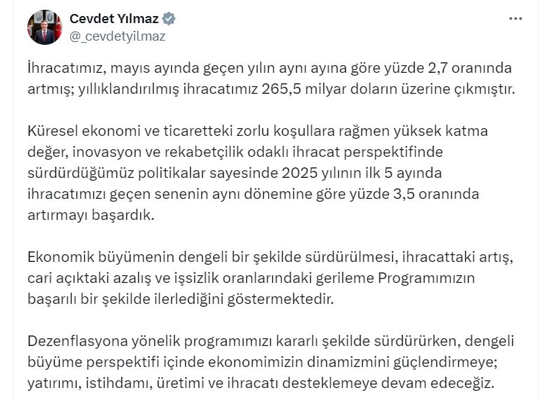 ANKARA, (DHA)- CUMHURBAŞKANI Yardımcısı Cevdet Yılmaz, "Küresel ekonomi ve ticaretteki zorlu koşullara rağmen yüksek katma değer, inovasyon ve rekabetçilik odaklı ihracat perspektifinde sürdürdüğümüz politikalar sayesinde 2025 yılının ilk 5 ayında ihracatımızı geçen senenin aynı dönemine göre yüzde 3,5 oranında artırmayı başardık" dedi.Cevdet Yılmaz, Ticaret Bakanı Ömer Bolat tarafından açıklanan 2025 yılı Mayıs ayına ait dış ticaret rakamlarını değerlendirdi. Yılmaz, sosyal medya hesabından yaptığı açıklamada, "İhracatımız, mayıs ayında geçen yılın aynı ayına göre yüzde 2,7 oranında artmış; yıllıklandırılmış ihracatımız 265,5 milyar doların üzerine çıkmıştır. Küresel ekonomi ve ticaretteki zorlu koşullara rağmen yüksek katma değer, inovasyon ve rekabetçilik odaklı ihracat perspektifinde sürdürdüğümüz politikalar sayesinde 2025 yılının ilk 5 ayında ihracatımızı geçen senenin aynı dönemine göre yüzde 3,5 oranında artırmayı başardık. Ekonomik büyümenin dengeli bir şekilde sürdürülmesi, ihracattaki artış, cari açıktaki azalış ve işsizlik oranlarındaki gerileme programımızın başarılı bir şekilde ilerlediğini göstermektedir. Dezenflasyona yönelik programımızı kararlı şekilde sürdürürken, dengeli büyüme perspektifi içinde ekonomimizin dinamizmini güçlendirmeye; yatırımı, istihdamı, üretimi ve ihracatı desteklemeye devam edeceğiz" ifadelerini kullandı. (DHA)