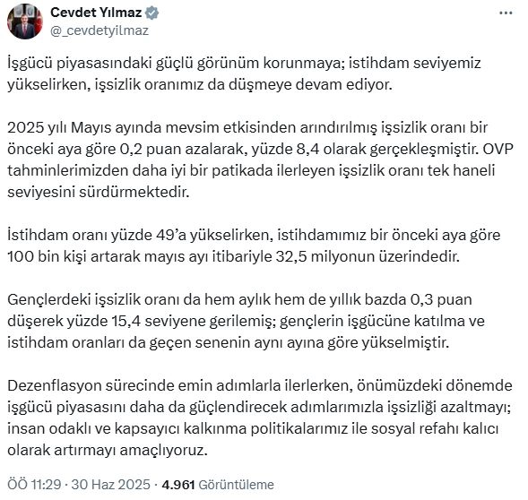 ANKARA, (DHA)- CUMHURBAŞKANI Yardımcısı Cevdet Yılmaz, "Dezenflasyon sürecinde emin adımlarla ilerlerken, önümüzdeki dönemde iş gücü piyasasını daha da güçlendirecek adımlarımızla işsizliği azaltmayı; insan odaklı ve kapsayıcı kalkınma politikalarımız ile sosyal refahı kalıcı olarak artırmayı amaçlıyoruz" dedi. Cumhurbaşkanı Yardımcısı Yılmaz, sosyal medya hesabından yaptığı paylaşımda, Türkiye İstatistik Kurumu (TÜİK) tarafından açıklanan Mayıs 2025 dönemi iş gücü istatistiklerine ilişkin değerlendirmede bulundu. Yılmaz, "İşgücü piyasasındaki güçlü görünüm korunmaya; istihdam seviyemiz yükselirken, işsizlik oranımız da düşmeye devam ediyor. 2025 yılı mayıs ayında mevsim etkisinden arındırılmış işsizlik oranı bir önceki aya göre 0,2 puan azalarak, yüzde 8,4 olarak gerçekleşmiştir. OVP tahminlerimizden daha iyi bir patikada ilerleyen işsizlik oranı tek haneli seviyesini sürdürmektedir. İstihdam oranı yüzde 49’a yükselirken, istihdamımız bir önceki aya göre 100 bin kişi artarak mayıs ayı itibarıyla 32,5 milyonun üzerindedir" dedi.YILLIK BAZDA 0,3 PUAN DÜŞTÜGençlerdeki işsizlik oranının da hem aylık hem de yıllık bazda 0,3 puan düşerek yüzde 15,4 seviyene gerilediğini kaydeden Yılmaz, şunları kaydetti: "Gençlerin iş gücüne katılma ve istihdam oranları da geçen senenin aynı ayına göre yükselmiştir. Dezenflasyon sürecinde emin adımlarla ilerlerken, önümüzdeki dönemde iş gücü piyasasını daha da güçlendirecek adımlarımızla işsizliği azaltmayı; insan odaklı ve kapsayıcı kalkınma politikalarımız ile sosyal refahı kalıcı olarak artırmayı amaçlıyoruz." (DHA)