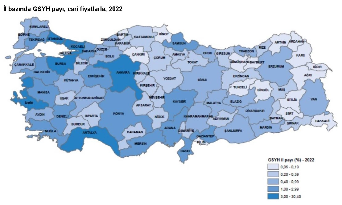 ANKARA, (DHA)- TÜRKİYE İstatistik Kurumu (TÜİK), gayrisafi yurt içi hasıladan (GSYH) en yüksek payı yüzde 30,4 ile İstanbul'un aldığını açıkladı. TÜİK, 2022 yılına ilişkin il bazında GSYH istatistiklerini açıkladı. Buna göre; 2022 yılında İstanbul 4 trilyon 564 milyar 280 milyon TL ile en yüksek GSYH'ye ulaştı ve toplam GSYH'den yüzde 30,4 pay aldı. İstanbul'u, 1 trilyon 329 milyar 810 milyon TL ve yüzde 8,9 pay ile Ankara, 972 milyar 238 milyon TL ve yüzde 6,5 pay ile İzmir izledi. İl düzeyinde GSYH hesaplarında son 3 sırada 11 milyar 288 milyon TL ile Tunceli, 10 milyar 539 milyon TL ile Ardahan ve 8 milyar 287 milyon TL ile Bayburt yer aldı. GSYH'den en yüksek payı alan ilk 5 il, 2022 yılında toplam GSYH'nin yüzde 53,9'unu oluşturdu. KOCAELİ, KİŞİ BAŞINA GSYH'DE İLK SIRADA Kişi başına GSYH'de, Kocaeli 302 bin 772 TL ile ilk sırada yer aldı. Kocaeli'yi, 287 bin 524 TL ile İstanbul ve 253 bin 501 TL ile Tekirdağ izledi. İl düzeyinde kişi başına GSYH hesaplamalarında, 64 bin 416 TL ile Şanlıurfa, 55 bin 296 TL ile Ağrı ve 54 bin 272 TL ile Van son 3 sırada yer aldı. Kişi başına GSYH, 2022 yılında 14 ilde Türkiye ortalamasının üzerinde gerçekleşti. GSYH'yi oluşturan faaliyetler incelendiğinde; 2022 yılında cari fiyatlarla GSYH'den en yüksek payı alan İstanbul, tarım sektörü ve diğer hizmet faaliyetleri hariç, tüm faaliyetlerde de ilk sırada yer aldı. YILLIK GSYH ARTIŞINA EN FAZLA KATKI VEREN İL İSTANBUL Yıllık GSYH, zincirlenmiş hacim endeksiyle 2022 yılında bir önceki yıla göre yüzde 5,5 artarken, 26 ilde Türkiye ortalamasının üzerinde artış gerçekleşti. Bir önceki yıla göre 2022'de en yüksek artış gösteren ilk 3 il sırasıyla yüzde 21,8 değişim oranı ile Antalya, yüzde 21,4 ile Kırşehir ve yüzde 17 ile Kilis oldu. Bir önceki yıla göre en yüksek azalış gösteren 3 il ise sırasıyla yüzde 9,4 ile Artvin, yüzde 9,5 ile Erzincan ve yüzde 11 değişim oranı ile Karabük oldu. Yıllık GSYH'nin artışına en fazla katkı veren il, yüzde 2,46 ile İstanbul oldu. İstanbul'u yüzde 0,65 ile Antalya ve yüzde 0,55 ile Ankara izledi. Yıllık GSYH büyümesine 2022 yılında negatif yönlü katkı veren illerin başında yüzde 0,03 ile Osmaniye, yüzde 0,03 ile Elazığ, yüzde 0,06 ile Hatay yer aldı. (DHA) FOTOĞRAFLI