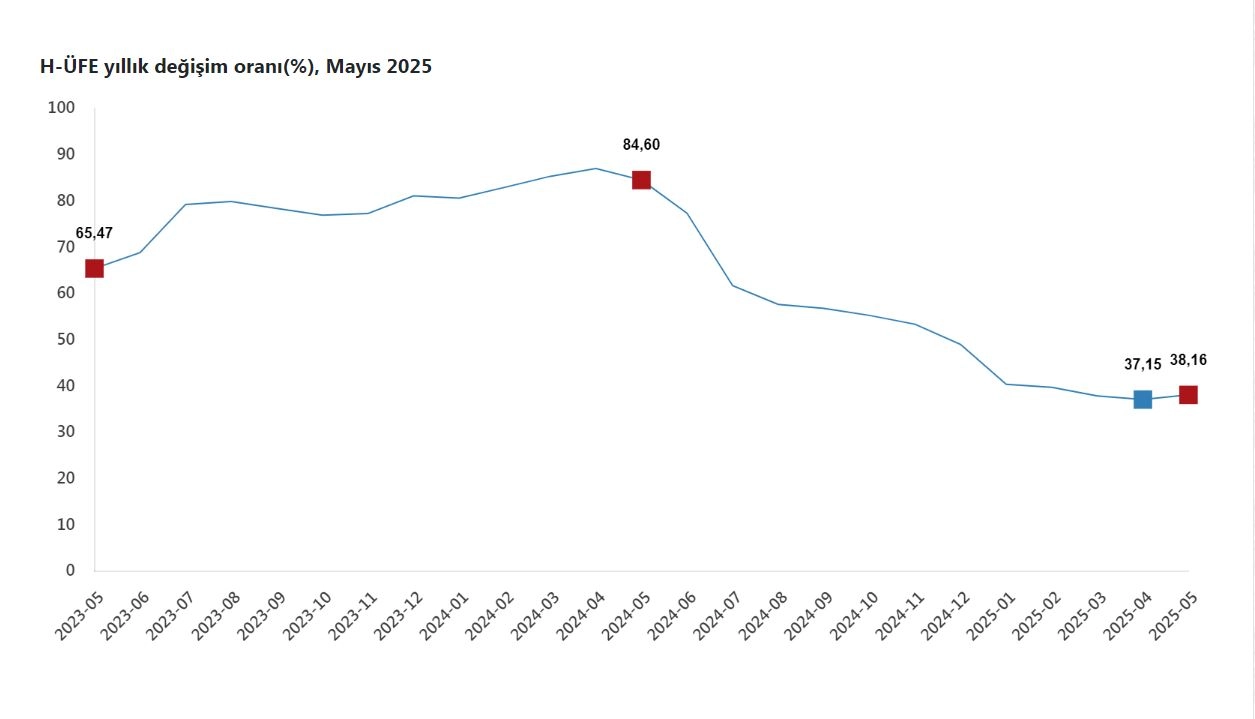 ANKARA, (DHA)- TÜRKİYE İstatistik Kurumu (TÜİK), Hizmet Üretici Fiyat Endeksi'nin (H-ÜFE) yıllık yüzde 38,16, aylık yüzde 2,37 arttığını açıkladı. TÜİK, H-ÜFE Mayıs 2025 verilerini açıkladı. Buna göre, H-ÜFE, 2025 yılı mayıs ayında bir önceki aya göre yüzde 2,37 artış, bir önceki yılın aralık ayına göre yüzde 21,42 artış, bir önceki yılın aynı ayına göre yüzde 38,16 artış ve 12 aylık ortalamalara göre yüzde 48,65 artış gösterdi. ULAŞTIRMA VE DEPOLAMA HİZMETLERİNDE YILLIK YÜZDE 31,33 ARTIŞ Bir önceki yılın aynı ayına göre, ulaştırma ve depolama hizmetlerinde yüzde 31,33 artış, konaklama ve yiyecek hizmetlerinde yüzde 38,38 artış, bilgi ve iletişim hizmetlerinde yüzde 46,69 artış, gayrimenkul hizmetlerinde yüzde 43,04 artış, mesleki, bilimsel ve teknik hizmetlerde yüzde 48,69 artış, idari ve destek hizmetlerde yüzde 43,68 artış gerçekleşti. AYLIK YÜZDE 1,33 ARTIŞ YAŞANDIBir önceki aya göre, ulaştırma ve depolama hizmetlerinde yüzde 1,33 artış, konaklama ve yiyecek hizmetlerinde yüzde 4,13 artış, bilgi ve iletişim hizmetlerinde yüzde 1,02 artış, gayrimenkul hizmetlerinde yüzde 7,41 artış, mesleki, bilimsel ve teknik hizmetlerde yüzde 1,12 artış, idari ve destek hizmetlerde yüzde 3,80 artış gerçekleşti. (DHA)
