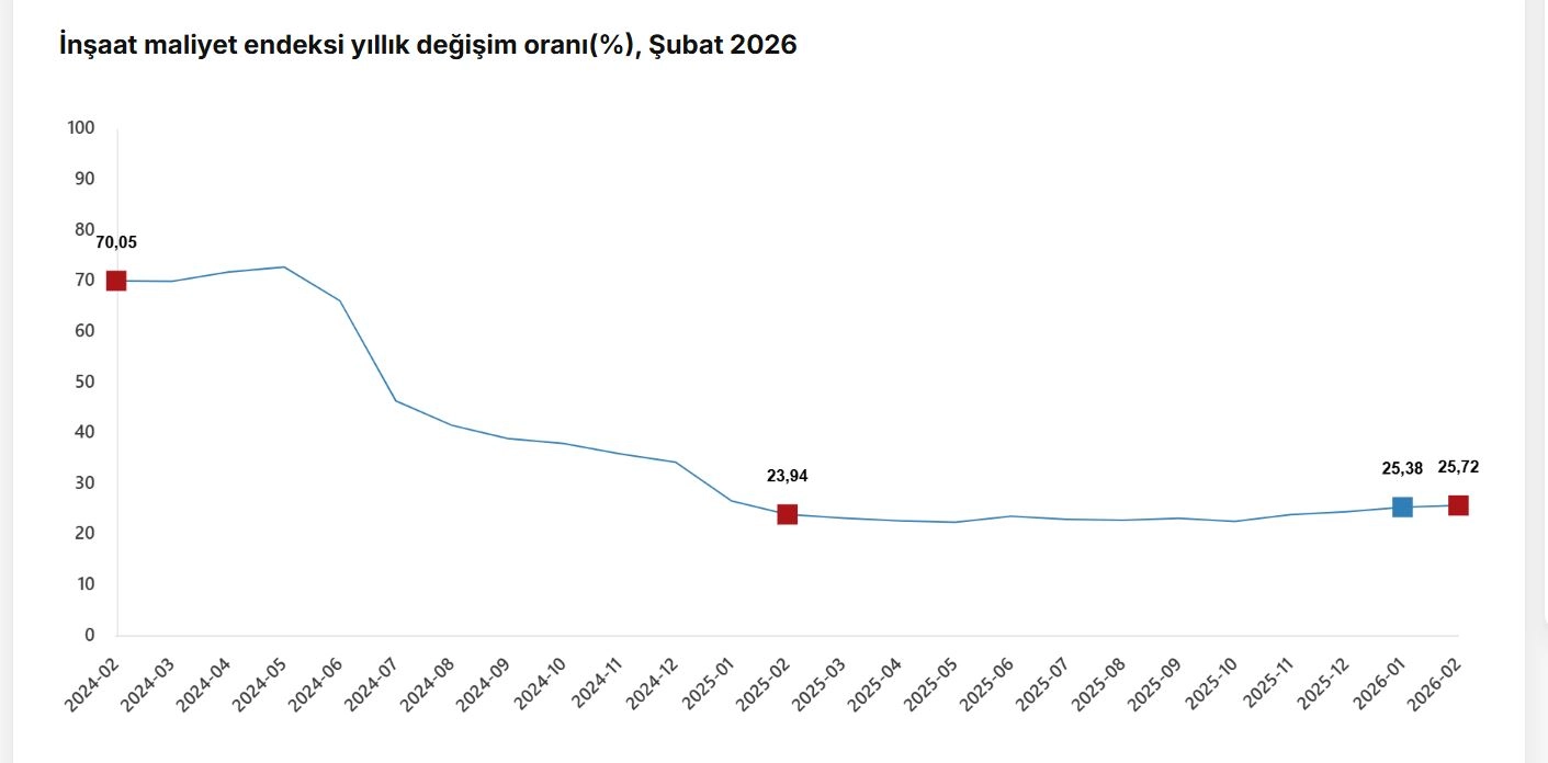 TÜİK, Şubat 2026 dönemine ilişkin inşaat maliyet endeksi verilerini açıkladı. Buna göre; inşaat maliyeti şubat ayında bir önceki aya göre yüzde 1,51, bir önceki yılın aynı ayına göre yüzde 25,72 arttı. Bir önceki aya göre malzeme endeksi yüzde 2,33, işçilik endeksi yüzde 0,20 arttı. Ayrıca bir önceki yılın aynı ayına göre malzeme endeksi yüzde 23,73, işçilik endeksi de yüzde 29,12 arttı. Bina inşaatı maliyet endeksi, bir önceki aya göre yüzde 1,25, bir önceki yılın aynı ayına göre yüzde 25,72 arttı. Bir önceki aya göre malzeme endeksi yüzde 2,08 arttı, işçilik endeksi yüzde 0,04 azaldı. Ayrıca bir önceki yılın aynı ayına göre malzeme endeksi yüzde 23,89, işçilik endeksi yüzde 28,74 arttı. Bina dışı yapılar için inşaat maliyet endeksi de bir önceki aya göre yüzde 2,36, bir önceki yılın aynı ayına göre yüzde 25,72 arttı. Bir önceki aya göre malzeme endeksi yüzde 3,11, işçilik endeksi yüzde 1,03 arttı. Ayrıca bir önceki yılın aynı ayına göre malzeme endeksi yüzde 23,24, işçilik endeksi yüzde 30,46 arttı. (DHA)