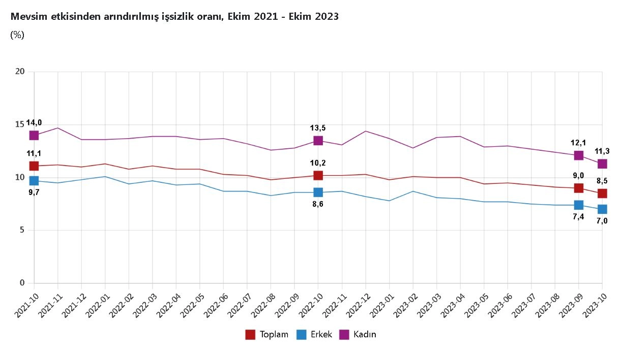 ANKARA, (DHA)- TÜRKİYE İstatistik Kurumu (TÜİK), ekim ayında işsizlik oranının önceki aya göre yüzde 0,5 puan azalarak yüzde 8,5 olduğunu açıkladı. TÜİK, Ekim 2023 dönemine ilişkin işgücü istatistiklerini açıkladı. Buna göre; işsiz sayısı ekim ayında bir önceki aya göre 163 bin kişi azalarak 2 milyon 961 bin kişi oldu. İşsizlik oranı 0,5 puan azalarak yüzde 8,5 seviyesinde gerçekleşti. İşsizlik oranı erkeklerde yüzde 7, kadınlarda yüzde 11,3. İstihdam edilenlerin sayısı, ekim ayında bir önceki aya göre 246 bin kişi artarak 31 milyon 835 bin kişi, istihdam oranı ise 0,3 puan artarak yüze 48,5 oldu. Bu oran erkeklerde yüzde 65,8, kadınlarda yüzde 31,6. GENÇ NÜFUSTA İŞSİZLİK ORANI YÜZDE 16,3 OLDU İşgücü, ekim ayında bir önceki aya göre 83 bin kişi artarak 34 milyon 796 bin kişi, işgücüne katılma oranı 0,1 puan artarak yüzde 53,1 oldu. İşgücüne katılma oranı erkeklerde yüzde 70,8, kadınlarda yüzde 35,7. 15- 24 yaş grubunu kapsayan genç nüfusta işsizlik oranı, bir önceki aya göre 0,4 puan azalarak yüzde 16,3 oldu. Bu yaş grubunda işsizlik oranı; erkeklerde yüzde 13,8, kadınlarda ise yüzde 21. İstihdam edilenlerden referans döneminde işbaşında olanların, haftalık ortalama fiili çalışma süresi ekim ayında bir önceki aya göre 0,2 saat azalarak 44 saat oldu. Zamana bağlı eksik istihdam, potansiyel işgücü ve işsizlerden oluşan atıl işgücü oranı, ekim ayında bir önceki aya göre 0,5 puan azalarak yüzde 21,3 oldu. Zamana bağlı eksik istihdam ve işsizlerin bütünleşik oranı yüzde 13,7, işsiz ve potansiyel işgücünün bütünleşik oranı yüzde 16,6 olarak gerçekleşti. (DHA)