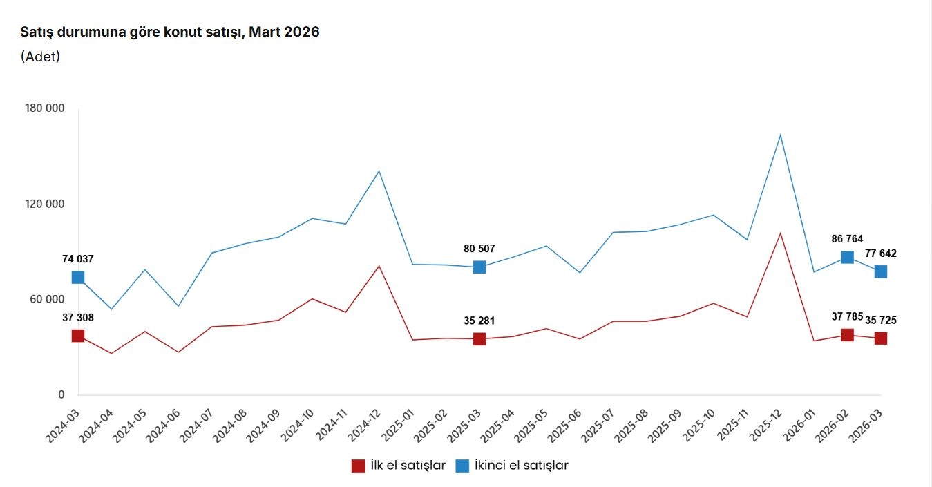 TÜİK, Mart 2026 dönemine ilişkin konut ve iş yeri satış istatistiklerini açıkladı. Buna göre; Türkiye genelinde ilk el konut satış sayısı mart ayında bir önceki yılın aynı ayına göre yüzde 1,3 oranında artarak 35 bin 725 oldu. İkinci el konut satışları ise mart ayında bir önceki yılın aynı ayına göre yüzde 3,6 oranında azalarak 77 bin 642 oldu. Toplam konut satışları içinde ilk el konut satışlarının payı yüzde 31,5, ikinci el konut satışlarının payı yüzde 68,5 oldu.