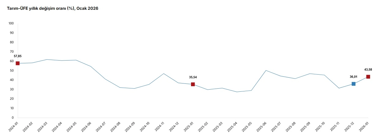 TÜİK, Ocak 2026 dönemine ilişkin tarım ürünleri üretici fiyat endeksi verilerini açıkladı. Buna göre; tarım ürünleri üretici fiyatları ocak ayında bir önceki aya göre yüzde 8,46, bir önceki yılın aynı ayına göre yüzde 43,58 ve 12 aylık ortalamalara göre yüzde 38,18 arttı.