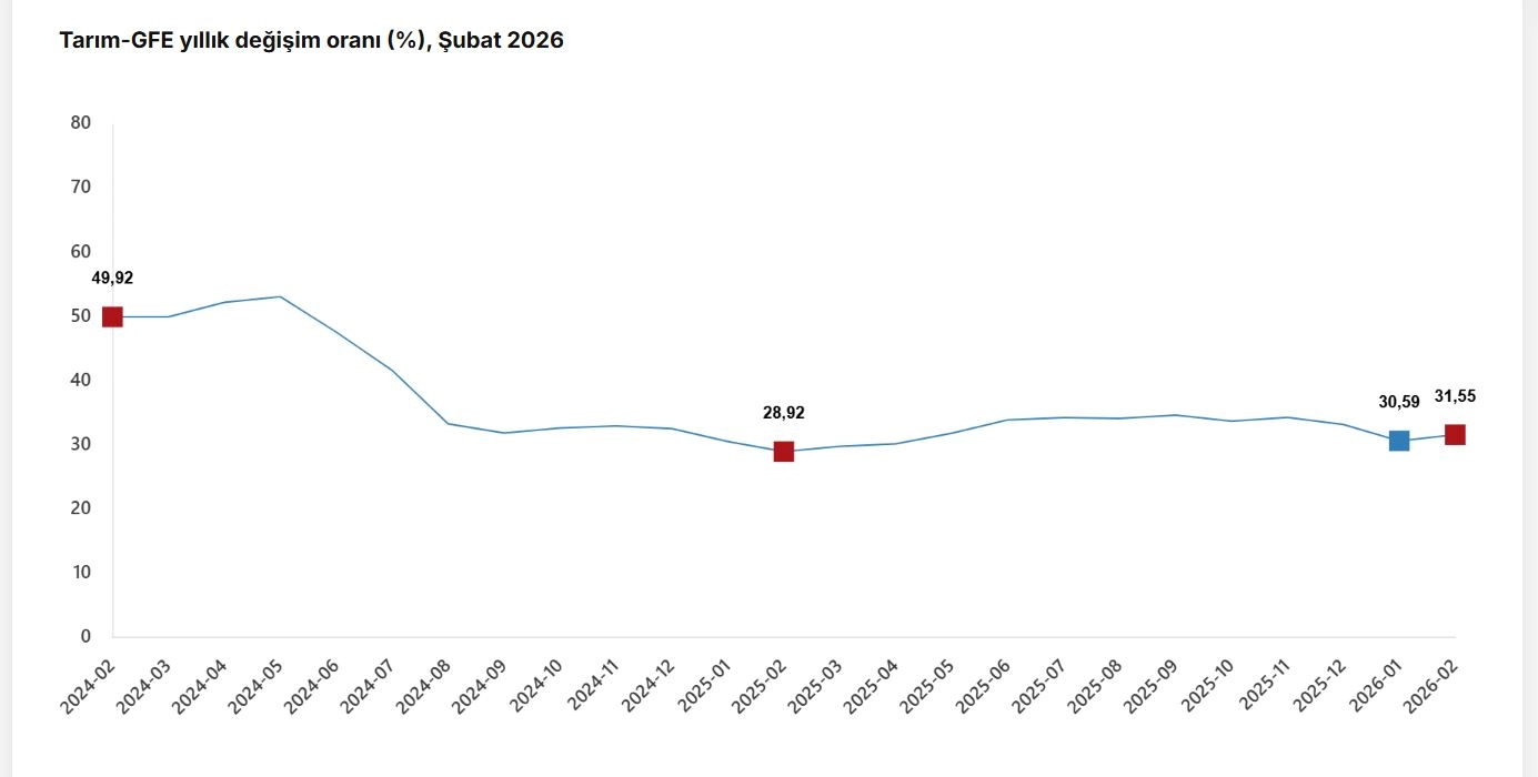 TÜİK, Şubat 2026 dönemine ilişkin tarımsal girdi fiyat endeksi verilerini açıkladı. Buna göre; tarımsal girdi fiyatları 2026 yılı Şubat ayında bir önceki aya göre yüzde 3,10, bir önceki yılın aralık ayına göre yüzde 7,08, bir önceki yılın aynı ayına göre yüzde 31,55 ve 12 aylık ortalamalara göre yüzde 32,64 arttı. Ana gruplarda bir önceki aya göre, tarımda kullanılan mal ve hizmetler endeksinde yüzde 2,96 artış, tarımsal yatırıma katkı sağlayan mal ve hizmetler endeksinde yüzde 3,94 artış gerçekleşti. Bir önceki yılın aynı ayına göre tarımda kullanılan mal ve hizmetler endeksinde yüzde 32,81 artış, tarımsal yatırıma katkı sağlayan mal ve hizmetler endeksinde yüzde 24,31 artış gerçekleşti. Yıllık değişimin en yüksek olduğu alt grup yüzde 41,37 artış ile veteriner harcamaları, aylık değişimin en yüksek olduğu alt grup yüzde 4,31 artış ile malzemeler oldu. (DHA)