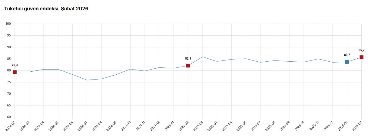 TÜİK, Şubat 2026 dönemine ilişkin tüketici güven endeksi verilerini açıkladı. Buna göre; tüketici güven endeksi, şubat ayında bir önceki aya göre yüzde 2,3 oranında artarak 85,7 oldu. Alt endekslerine bakıldığında; bir önceki aya göre mevcut dönemde hanenin maddi durumu endeksi 4,6 artarak 71,3, gelecek 12 aylık dönemde hanenin maddi durum beklentisi endeksi 4,2 artarak 86,8, gelecek 12 aylık dönemde genel ekonomik durum beklentisi endeksi 0,1 azalarak 81,4 ve gelecek 12 aylık dönemde dayanıklı tüketim mallarına harcama yapma düşüncesi endeksi 1,3 artarak 103,2 değerlerini aldı. (DHA)