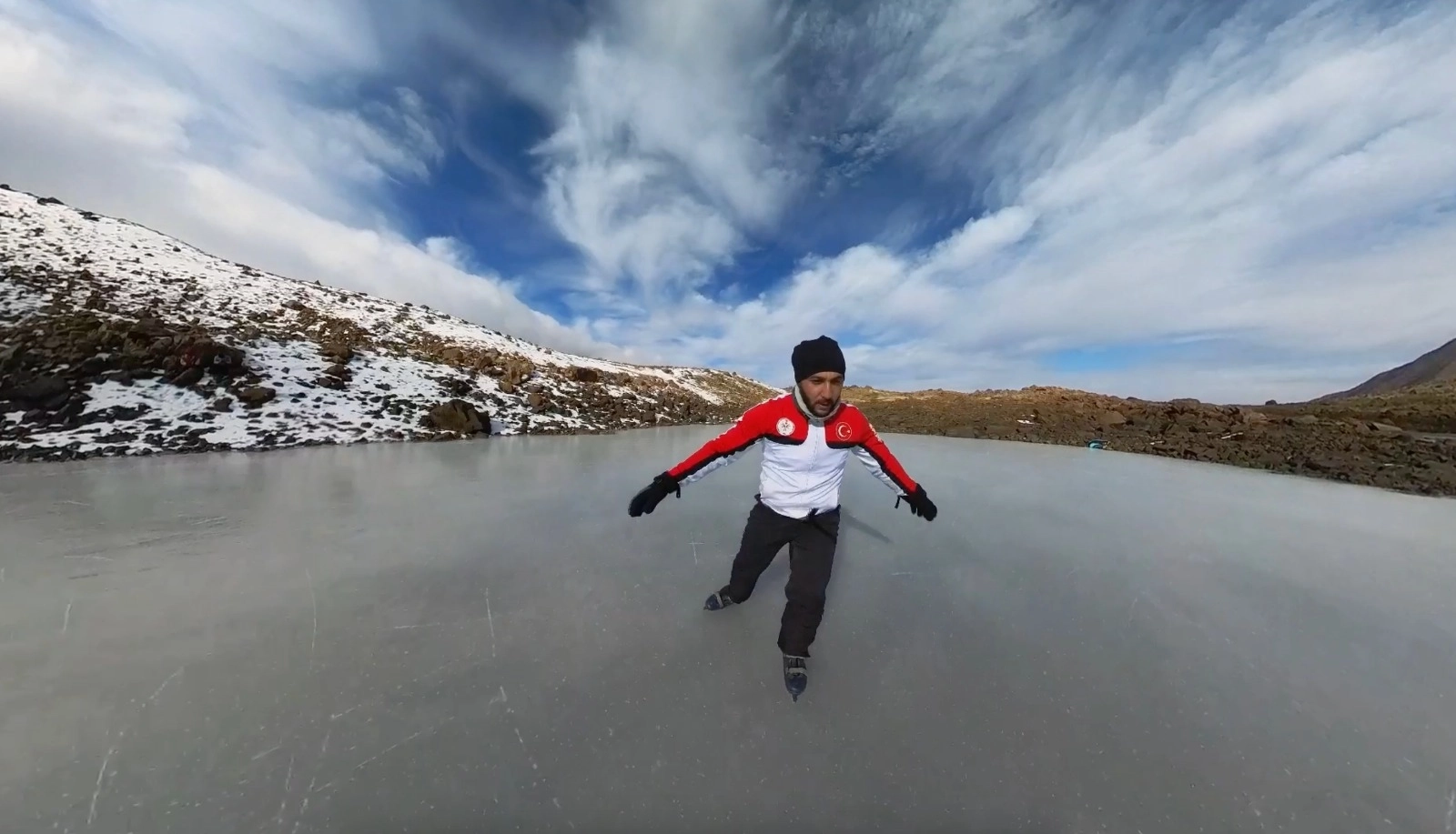 Muzaffer KOŞAN/ERZİNCAN,(DHA)-ERZİNCAN'da kros motoru ile 3 bin 549 metre yükseklikteki Keşiş Dağları'na giden kayak antrenörü Canser Atila, buz tutan gölette buz pateni yaptı. Kros motoru ile Keşiş Dağları Yedi Göller mevkisine giden Canser Atila, burada buz tutan gölette buz pateni yaptı. Atila'nın buz pateni yaptığı anlar, cep telefonu kamerasına da yansıdı. Erzincan'da 1 günde dört mevsimin yaşandığını belirten Canser Atila, "Arkadaşlar ile Keşiş Dağları'nın eteğindeki Yedi Göller mevkisine geldik. Havaların sıfırın altına düşmesi ile gölün yüzeyi, 15-20 santimetre buzla kaplanıyor. Bunu fırsata çevirerek, buz patenlerimizi alıp, kros motorlar ile zorlu yolları aşarak, buraya geldik. Geldiğimize de değdi. Buz üzerinde çok eğlenceli vakit geçirdik. Erzincan, coğrafi bakımdan dört mevsimi aynı anda yaşatıyor" dedi