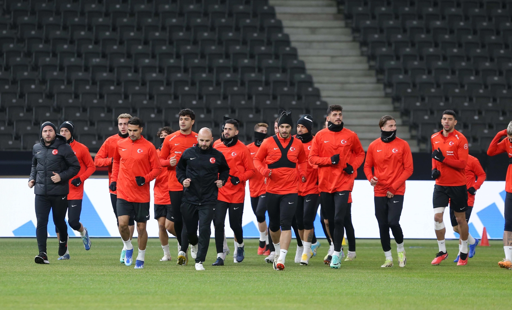 Serhan TÜRK/BERLIN(ALMANYA) - (DHA) - Almanya ile yarın özel maçta karşı karşıya gelecek A Milli Futbol Takımı, hazırlıklarına devam etti. Berlin Olimpiyat Stadyumu'nda teknik direktör Vincenzo Montella yönetiminde gerçekleştirilen çalışmaya aday kadroda yer alan futbolcuların tamamı katıldı. Isınma hareketlerinin ardından dar alanda pas çalışması yapan oyuncular, son bölümde ise çift kaleli taktik uygulamalar üzerinde çalıştı. Ay-yıldızlıların antrenmanını Türkiye Futbol Federasyonu Başkanı Mehmet Büyükekşi, Başkan Vekilleri Yalçın Orhan, Yusuf Günay, Mustafa Eröğüt, Millî Takımlar Sorumlusu Hamit Altıntop, Yönetim Kurulu Üyeleri Talat Papatya ve Cengiz Erdim ile Genel Sekreter Taner Senseven tribünden takip etti. Milliler, yarın kamp yaptığı otelde basına kapalı olarak gerçekleştirilecek son antrenmanla Almanya maçının hazırlıklarını tamamlayacak. Türkiye, yarın TSİ 22.45'te Berlin Olimpiyat Stadyumu'nda Almanya ile karşılaşacak. Müsabakayı Polonya Futbol Federasyonundan hakem Bartosz Frankowski yönetecek. (FOTOĞRAFLI)