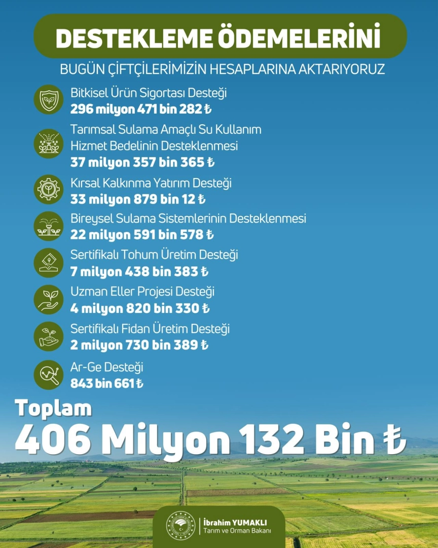 ANKARA, (DHA)- TARIM ve Orman Bakanı İbrahim Yumaklı, "406 milyon 132 bin TL tarımsal destekleme ödemesini bugün çiftçilerimizin hesaplarına aktarıyoruz" dedi. Tarım ve Orman Bakanı Yumaklı sosyal medya üzerinden yaptığı paylaşım ile tarımsal destekleme ödemelerinin bugün çiftçilerin hesaplarına yatırılacağını duyurdu. Bakan Yumaklı tarafından yapılan paylaşımda, toplam 406 milyon 132 bin TL tarımsal destekleme ödemesi yapılacağı belirtilirken; bitkisel ürün sigortası 296 milyon 471 bin 282 TL, tarımsal sulama amaçlı su kullanım hizmet bedelinin desteklenmesi 37 milyon 357 bin 365 TL, kırsal kalkınma yatırım 33 milyon 879 bin 12 TL, bireysel sulama sistemlerinin desteklenmesi 22 milyon 591 bin 578 TL, sertifikalı tohum üretim 7 milyon 438 bin 383 TL, uzman eller projesi 4 milyon 820 bin 330 TL, sertifikalı fidan üretim 2 milyon 730 bin 389 TL ve Ar-Ge desteğinin 843 bin 661 TL olacağı ifade edildi. (DHA)