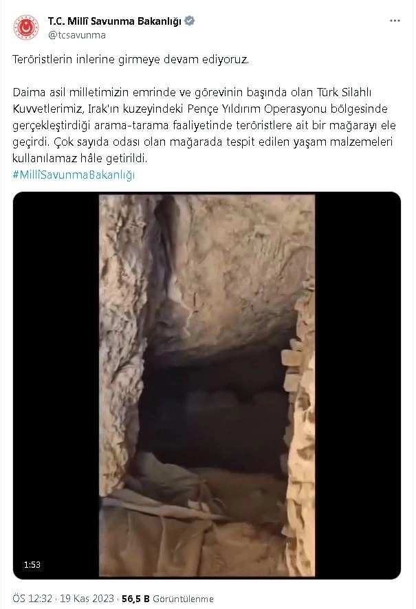 ANKARA, (DHA)- IRAK'ın kuzeyindeki Pençe Yıldırım Operasyonu bölgesinde, teröristlerin barındığı çok sayıda odası bulunan mağara, kullanılamaz hale getirildi. Milli Savunma Bakanlığı, Pençe Yıldırım Operasyonu bölgesinde arama tarama faaliyeti yürüten Mehmetçik'in bulduğu, 3 katı ve çok sayıda odası bulunan mağaranın görüntülerini paylaştı. Bakanlığın sosyal medya hesabından yapılan açıklamada, "Teröristlerin inlerine girmeye devam ediyoruz. Daima asil milletimizin emrinde ve görevinin başında olan Türk Silahlı Kuvvetlerimiz, Irak'ın kuzeyindeki Pençe Yıldırım Operasyonu bölgesinde gerçekleştirdiği arama tarama faaliyetinde teröristlere ait bir mağarayı ele geçirdi. Çok sayıda odası olan mağarada tespit edilen yaşam malzemeleri kullanılamaz hale getirildi" denildi. (DHA)