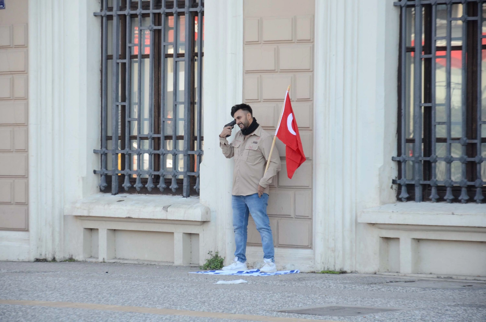 Tolga TAHÇI/ İZMİR, (DHA)- İZMİR'de, İsrail bayrağının üzerine basıp, başına tabanca dayayan ve 2 saat sonra görüşmelerin ardından ikna edilerek eylemine son veren Pakistan uyruklu Muhammed N. (23) tutuklandı. Olay dün saat 13.00 sıralarında Cumhuriyet Bulvarı'nda meydana geldi. Kiraladığı otomobille caddeye gelen Muhammed N. (23) araçtan inip, elindeki İsrail bayrağını yere serip üzerine bastı. Daha sonra eline Türk bayrağı alan Muhammed N, başına tabanca dayayıp eylem gerçekleştirdi. Olay yerine çok sayıda polis ve sağlık ekibi sevk edildi. Yaklaşık 2 saat süren ikna çalışmalarının ardından şüpheli elindeki silahı bırakıp teslim oldu ve gözaltına alındı. Geçen yıl da karnına ateş edip intihara teşebbüs ettiği öğrenilen şüpheli, emniyetteki işlemlerinin tamamlanmasının ardından adliyeye sevk edildi. Mahkemeye çıkarılan Muhammet N., tutuklanarak cezaevine gönderildi. (DHA)