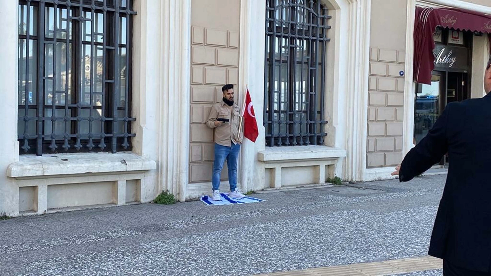 Tolga TAHÇI/İZMİR, (DHA)-İZMİR'de elinde Türk bayrağı olan kişi, yere serdiği İsrail bayrağının üzerine basıp, başına tabanca dayadı. Polis, kişiyi ikna etmeye çalışıyor. Konak ilçesi Cumhuriyet Bulvarı'na saat 13.00 sıralarında otomobili ile gelen bir kişi, araçtan inip, elindeki İsrail bayrağını yere serdi. Daha sonra eline Türk bayrağı alan isminin Muhammet olduğu öğrenilen kişi, başına tabanca dayadı. Bunun üzerine çevredekilerin ihbarı sonrası olay yerine polis ve sağlık ekipleri sevk edildi. Polis, kişinin elindeki tabancayı bırakması için çabalarını sürdürüyor. (DHA)