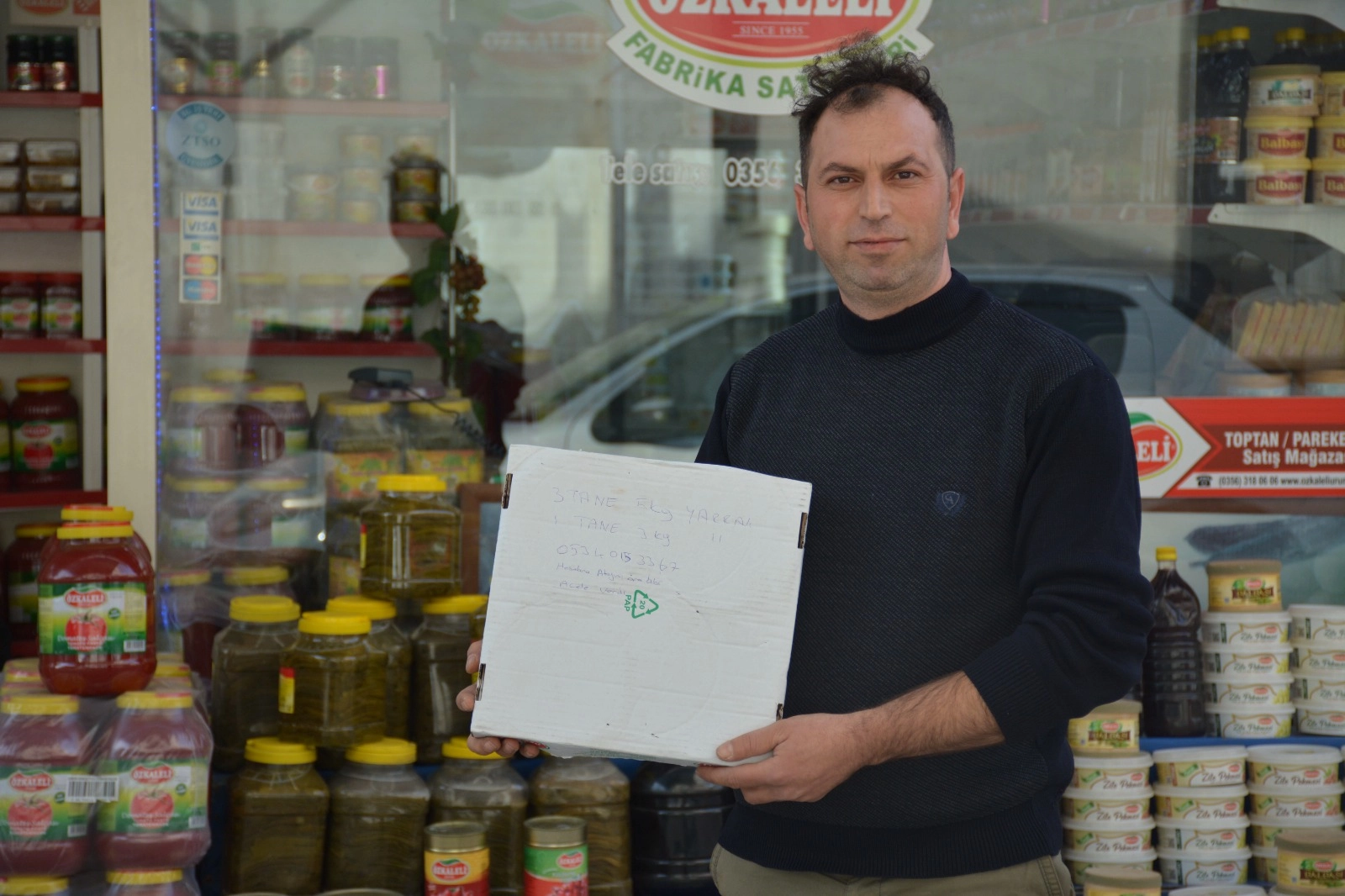 Yaşar Erkan İÇEN/ZİLE (Tokat), (DHA)- TOKAT’ın Zile ilçesinde alışveriş için yöresel ürün satan markete giden Hüseyin Ablak, dükkan sahibini bulamayınca kapı önündeki 5 kiloluk 3 bidon asma yaprak alarak, ‘Hesabına atayım ara abi’ yazılı not ve telefon numarasını bıraktı. Dükkan sahibi Şahin Kaya’nın aradığı Ablak, ürünlerin tutarı olan 1420 lirayı verilen hesaba yatırdı. Zile ilçesi Amasya Caddesi'nde yöresel ürün satışı yapan Şahin Kaya (33), dün akşam saatlerinde tıraş olmak için dükkanı kapatıp, gitti. Dükkana alışverişe gelen Hüseyin Ablak, Kaya'yı bulamayınca kapının önündeki 5 kiloluk, 3 adet içinde asma yaprak bulunan bidonu alıp, aracına yükledi. Dükkanın kapısına da 'Hesabına atayım ara abi. Acelem vardı’ üzerinde telefon numarasının yazılı olduğu notu bıraktı. Arkadaşlarının şaka yaptığını sanan iş yeri sahibi Şahin Kaya, “Notu görünce şaşırdım. Şaşkınlığı atınca da aradım görüştük. Aldığı ürünlerin tutarı 1420 lirayı hesabıma gönderdi” dedi. (DHA)