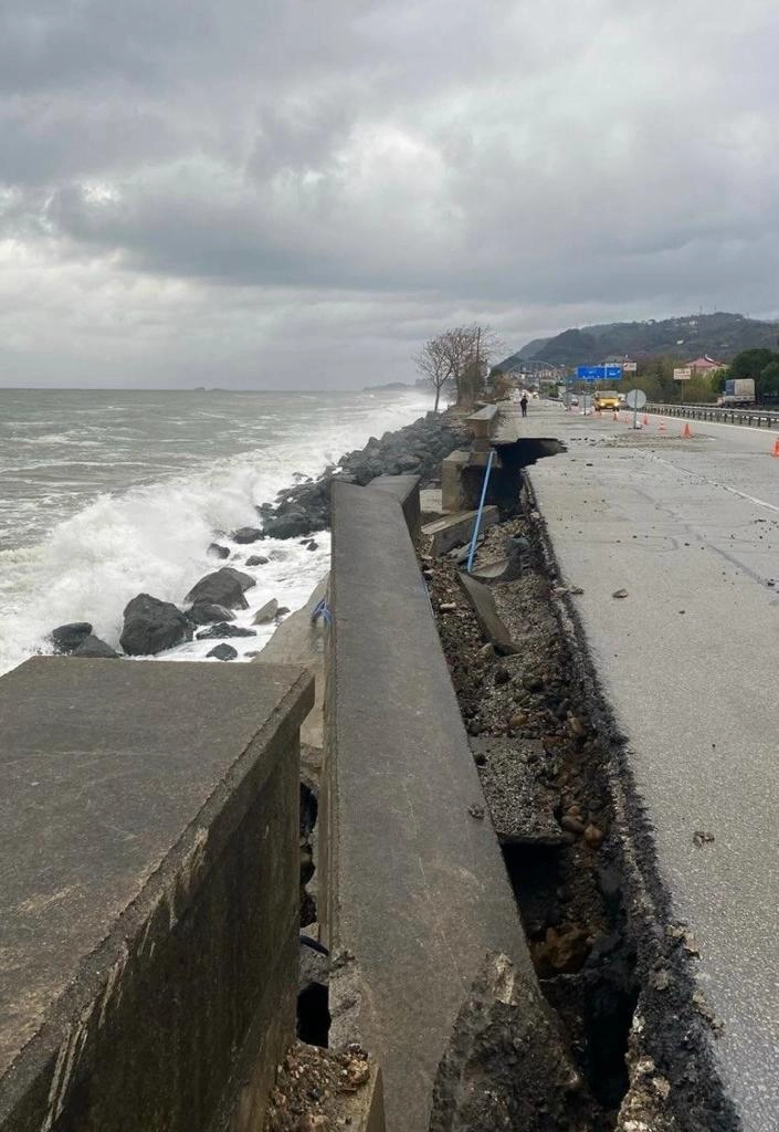 Hakan KABAHASANOĞLU/ ESPİYE, (Giresun), (DHA)- GİRESUN'un Espiye ilçesinde etkili olan fırtına nedeniyle dalgaların yıktığı duvar ve çökme yaşanan Karadeniz Sahil Yolu'nda oluşan hasarın boyutu, gün ağarınca ortaya çıktı. Doğu Karadeniz Bölgesi'nde dün akşam saatlerinde sağanak ve fırtına etkili oldu. Espiye ilçesi Yalı Mahallesi'nde de etkili olan fırtına nedeniyle denizde oluşan dalgalar, Karadeniz Sahil Yolu'nun Giresun-Ordu güzergahında hasara yol açtı. Fırtınanın etkisiyle kıyıda sahil yoluna paralel uzanan beton duvarın bir bölümü, dalgaların alt kısmını aşındırması nedeniyle yıkıldı. Duvarın yıkılması sonucu Güce Kavşağı mevkisinde kara yolunun bir kısmında çökme meydana geldi. Yoldan geçen sürücülerin ihbarıyla bölgeye Karayolları ekipleri ve trafik polisleri sevk edildi. Ekipler, bölgede uyarıcı levhalar koyarak güvenlik önlemi aldı. Tek şeritten kontrollü olarak ulaşımın sağlandığı Sahil Yolu'nda etkili fırtına kaynaklı hasarın boyutu da gün ağarınca ortaya çıktı. Dalgaların kara yolunun önemli bir kesimine zarar verdiği görüldü. Önlem alınan yolda onarım çalışmalarına, kısa sürede başlanacağı bildirildi. (DHA) FOTOĞRAFLI