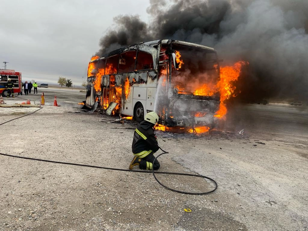 Atilla ATMACA/EREĞLİ (Konya), (DHA)- KONYA'nın Ereğli ilçesinde seyir halinde yolcu otobüsü alev aldı. Şoför 40 yolcuyu tahliye ederken, yangın itfaiye ekiplerince söndürüldü. Olay, saat 08.00 sıralarında Adana-Konya kara yolu Çakmak Mahallesi yakınlarında meydana geldi. İzmir'den Hatay'a seyreden Abdullah Yalman idaresindeki 31 AJD 431 plakalı yolcu otobüsü, motor kısmından alev aldı. Durumu fark eden şoför, otobüsü durdurarak 40 yolcuyu tahliye etti. Bu sırada alevler tüm otobüsü sardı. İhbarla olay yerine itfaiye, sağlık, jandarma ve polis ekibi sevk edildi. Ekipler, alevleri söndürürken, olay il e ilgili soruşturma başlatıldı. (DHA)