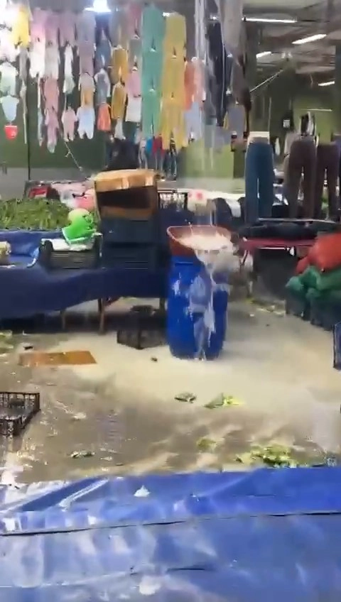 Baran AKKAYA - Vehbi DEMİR/İSTANBUL,(DHA)- KÜÇÜKÇEKMECE'de etkili olan yağmur sonrasında kapalı pazarı su bastı. Küçükçekmece Halkalı Kapalı pazarında kuvvetli yağışın etkisiyle giderler patladı. Yağmur suyu pazar içerisine akmaya başladı. Pazar esnafı patlayan giderleri bezlerle sararak önlem almaya çalıştı. Kapalı pazar içerisinde, bazı esnaf ise tezgâhlarına su gelmemesi için çadır kurdu. Pazarcı Erhan Cilalı, "Müşteri dışarda yağmurlu havada yürümeyi tercih etmiyor, kapalı pazarı tercih ediyor. Kapalı pazar daha berbat. Su akıyor; sabahları tezgâh açamıyoruz, yürüyemiyoruz. Çok mağduruz. Esnafa hiçbir konuda yardımcı olmuyorlar. Yaklaşık altı yıldır da böyle. Pazar çok kötü durumda, elverişli değil. Bizi açıktan alıp kapalıya verdiler kapalıya vermeseydiler daha iyiydi" dedi. (FOTOĞRAF)