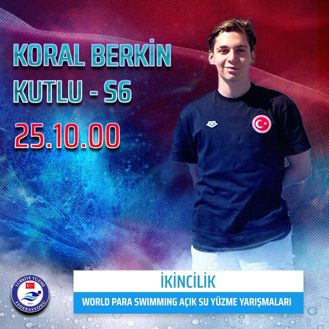 İSTANBUL, (DHA) - Milli para yüzücü Koral Berkin Kutlu, İtalya'daki Dünya Açık Su Yüzme Yarışmaları'nda S6 kategorisinde 2'nci oldu. Türkiye Yüzme Federasyonu'ndan yapılan açıklamaya göre milli sporcu Koral Berkin Kutlu, 1.5 km mesafesinde 25.10.00’luk derecesiyle 2'nci sırayı aldı. Açıklamada ayrıca sporcu ve antrenörü "Başarılarından dolayı sporcumuz Koral Berkin Kutlu ve antrenörü Mehmet Fatih Kurt’u tebrik ederiz" sözleriyle kutlandı. (FOTOĞRAFLI)