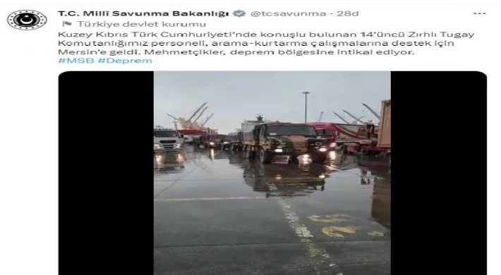 ANKARA, (DHA)- MİLLİ Savunma Bakanlığı (MSB), Kuzey Kıbrıs Türk Cumhuriyeti'nde (KKTC) konuşlu bulunan 14'üncü Zırhlı Tugay Komutanlığı personelinin arama- kurtarma çalışmalarına destek vermek üzere Mersin'e geldiğini duyurdu. Bakanlığın Twitter hesabından yapılan paylaşımda, "Kuzey Kıbrıs Türk Cumhuriyeti’nde konuşlu bulunan 14’üncü Zırhlı Tugay Komutanlığımız personeli, arama- kurtarma çalışmalarına destek için Mersin’e geldi. Mehmetçikler, deprem bölgesine intikal ediyor" denildi. (DHA)