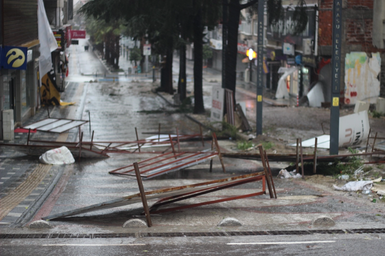 Levent KIZILASLAN/KARASU(Sakarya),(DHA)-SAKARYA'nın Karasu ilçesinde sağanak ve fırtına nedeniyle ağaçlar devrildi, bazı binaların çatıları uçtu. Karasu'da gece boyunca sağanak ve fırtına, etkili oldu. Plaj Caddesi'nde ağaçlar kökünden sökülüp devrildi, bazı binaların çatıları uçtu. Uçan parçalar caddeye savulurken, Karasu Belediyesi ekipleri, fırtınanın vurduğu bölgelerde çalışma başlattı.(DHA)