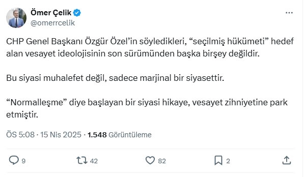 ANKARA, (DHA)- AK Parti Genel Başkan Yardımcısı ve Parti Sözcüsü Ömer Çelik, CHP Genel Başkanı Özgür Özel'in TBMM 'Grup Toplantısı'ndaki sözlerine ilişkin, "Normalleşme' diye başlayan bir siyasi hikaye, vesayet zihniyetine park etmiştir" dedi.AK Parti'li Ömer Çelik, sosyal medya hesabından açıklama yaptı. Çelik, Özel'in TBMM 'Grup Toplantısı'ndaki sözlerine ilişkin, "CHP Genel Başkanı Özgür Özel’in söyledikleri, 'seçilmiş hükümeti' hedef alan vesayet ideolojisinin son sürümünden başka bir şey değildir. Bu siyasi muhalefet değil, sadece marjinal bir siyasettir. 'Normalleşme' diye başlayan bir siyasi hikaye, vesayet zihniyetine park etmiştir" ifadelerini kullandı. (DHA)