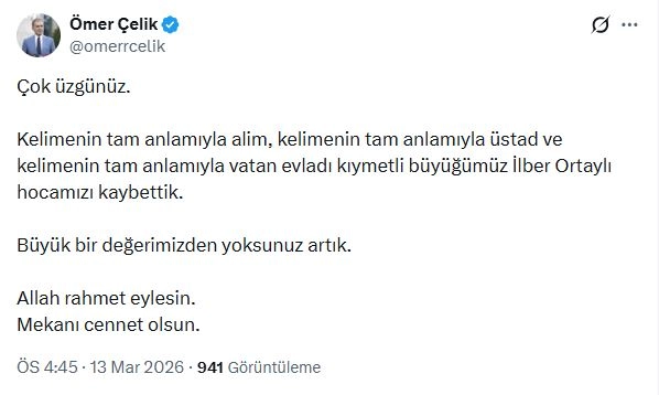 AK Parti'li Ömer Çelik, sanal medya hesabından paylaştığı mesajında, "Çok üzgünüz. Kelimenin tam anlamıyla alim, kelimenin tam anlamıyla üstad ve kelimenin tam anlamıyla vatan evladı kıymetli büyüğümüz İlber Ortaylı hocamızı kaybettik. Büyük bir değerimizden yoksunuz artık. Allah rahmet eylesin. Mekanı cennet olsun" ifadelerini kullandı. (DHA)