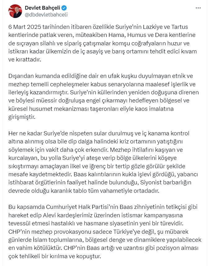 ANKARA, (DHA)- MHP Genel Başkanı Devlet Bahçeli, "CHP'nin Baas artığı ve uzantısı gibi pozisyon alması çok tehlikeli bir kırılma ve kopuştur. Alevi kardeşlerimiz bizim canımız ve ciğerparemiz; milletimizin ve İslam aleminin ayrılmaz, ayrılamaz ve ayrı görülemez inanç ve insanlık değerleridir" dedi.Bahçeli, sosyal medya hesabından yaptığı açıklamada, "6 Mart 2025 tarihinden itibaren özellikle Suriye’nin Lazkiye ve Tartus kentlerinde patlak veren, müteakiben Hama, Humus ve Dera kentlerine de sıçrayan silahlı ve sipariş çatışmalar komşu coğrafyaların huzur ve istikrarı kadar ülkemizin de iç asayiş ve barış ortamını tehdit edici kıvam ve kırattadır. Dışarıdan kumanda edildiğine dair en ufak kuşku duyulmayan etnik ve mezhep temelli cepheleşmeler kabus senaryolarına maalesef işlerlik ve ilerleyiş kazandırmıştır. Suriye’nin küllerinden yeniden doğuşuna direnen ve böylesi müessir doğruluşa engel çıkarmayı hedefleyen bölgesel ve küresel husumet mekanizması taşeronları eliyle kaos imalatına girişmiştir. Her ne kadar Suriye’de nispeten sular durulmuş ve iç kanama kontrol altına alınmış olsa bile dip dalga halindeki kriz ortamının yatıştığını söylemek için vakit daha çok erkendir. Mezhep ihtilafını kaşıyan ve kurcalayan, bu yolla Suriye’yi ateşe verip bölge ülkelerini köşeye sıkıştırmayı amaçlayan ilkel ve iğrenç bir tertip gözle görülür şekilde mesafe kaydetmektedir. Baas kalıntılarının kukla işlevi gördüğü, yabancı istihbarat örgütlerinin faaliyet halinde bulunduğu, siyonist barbarlığın devrede olduğu karanlık tablo tüm vahametiyle ortadadır" dedi.'BÖLGESEL DENGE VE DİNAMİKLERE YAPILABİLECEK EN VAHİM KÖTÜLÜK'Cumhuriyet Halk Partisi'nin Baas zihniyetinin tetikçisi gibi hareket ettiğini söyleyen Bahçeli, "Aleviler kardeşlerimiz üzerinden istismar kampanyasına tevessül etmesi hastalıklı ve hasmane siyasetinin yeni bir türevidir. CHP’nin mezhep provokasyonu sadece Türkiye’ye değil, şu mübarek günlerde İslam toplumlarına, bölgesel denge ve dinamiklere yapılabilecek en vahim kötülüktür. CHP’nin Baas artığı ve uzantısı gibi pozisyon alması çok tehlikeli bir kırılma ve kopuştur. Alevi kardeşlerimiz bizim canımız ve ciğerparemiz; milletimizin ve İslam aleminin ayrılmaz, ayrılamaz ve ayrı görülemez inanç ve insanlık değerleridir. Bizim nezdimizde Alevi ile Sünni arasına uçurum kazanlar, bunlar arasında ikilik çıkaranlar, yetmezmiş gibi birbirine uzak ve yabancı gibi takdim edenler din, diyanet, millet ve ümmet düşmanlarıdır. Ne Alevi kardeşlerimiz ne de Sünni kardeşlerimiz ölümcül oyunlara aldanmayacak, buna da asla kanmayacaktır. CHP’nin yolu yol değildir. CHP’li yönetici ve milletvekillerinin açıklamaları fitne ve fücura ön açmak, öncü olmak manasından başka yorumlanamayacaktır. Siyasi mezhepçilik ve etnik ayrımcılık peşinde koşanlar hem insanlık suçu işlemekte hem de yasa ve anayasaya aykırı emel ve eylemlere ortak olmaktadır" açıklamasında bulundu. 'DEM PARTİ'NİN KARARINI BİLLURLAŞTIRMASI ACİL BİR İHTİYAÇTIR'DEM Parti'nin de bu gelişmeler karşısında duruşunu ve tutumunu netleştirmesinde yarar olduğunu kaydeden Bahçeli, şunları kaydetti: "CHP veya diğer partilerle temaslarında 27 Şubat İmralı çağrısını mı konuşacaklar, yoksa etnik ve mezhebi hassasiyetleri tahrip edici adım ve arayış halinde olan partilerin fason ve fosilleşmiş ezberlerini dinleyip ortak mı olacaklar? PKK’nın kurucu önderi tarafından hazırlanan 'Barış ve Demokratik Toplum Çağrısı'nın gereğini mi ifa edecekler ya da Suriye bahanesiyle Türkiye'nin iç kargaşa ve karışıklığa düşmesini projelendiren çürümüş siyasi zihniyetlere aracılık mı yapacaklar? DEM Parti’nin bu çerçevede kararını billurlaştırması acil ve amik bir ihtiyaçtır. Türkiye, kalıcı ve kategorik ölçüde terörü millet ve devlet hayatından çıkarmanın arifesindeyken etnik ve mezhebi tahrikleri siyasi araç ve argüman olarak kullanan fırsatçı, fırıldak ve fikirsiz siyasetçileri ne Allah affedecek ne de aziz Türk milleti hoş görecektir. Milliyetçi Hareket Partisi, bir beladan kurtuluşun mücadelesi verilirken, diğer ve daha dehşet uyandıran nevzuhur sorunların yeşertilmesinden kaygılıdır ve herkesi, bilhassa siyasi partileri ahlaklı, duyarlı, milli ve sorumlu olmaya davet etmektedir. Unutulmasın ki, ateşe dökülen benzin ilk dökeni yakacak; rüzgardan kim medet umuyorsa önce onun çatısı uçacaktır." (DHA)