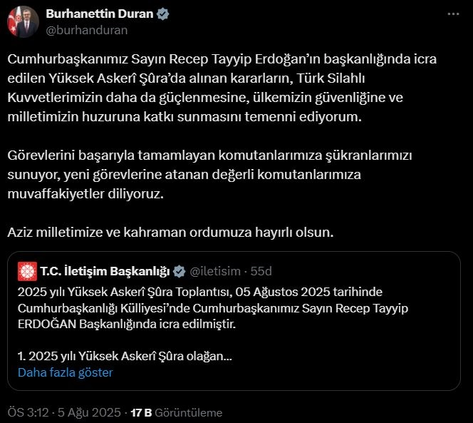 ANKARA, (DHA)- İLETİŞİM Başkanı Burhanettin Duran, Yüksek Askeri Şura'da (YAŞ) alınan kararların hayırlı olması dileğinde bulundu. İletişim Başkanı Duran, sosyal medya hesabından yaptığı paylaşımda, "Cumhurbaşkanımız Sayın Recep Tayyip Erdoğan’ın başkanlığında icra edilen Yüksek Askeri Şura'da alınan kararların, Türk Silahlı Kuvvetlerimizin daha da güçlenmesine, ülkemizin güvenliğine ve milletimizin huzuruna katkı sunmasını temenni ediyorum. Görevlerini başarıyla tamamlayan komutanlarımıza şükranlarımızı sunuyor, yeni görevlerine atanan değerli komutanlarımıza muvaffakiyetler diliyoruz. Aziz milletimize ve kahraman ordumuza hayırlı olsun" ifadelerini kullandı. (DHA)