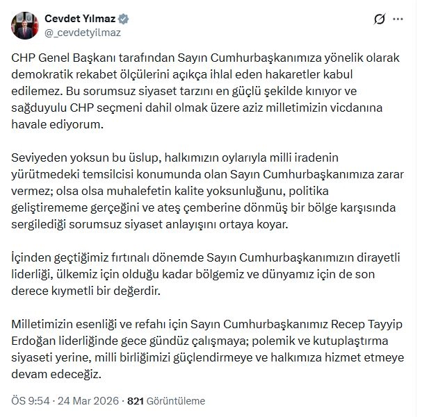Cumhurbaşkanı Yardımcısı Yılmaz, sanal medya üzerinden yaptığı paylaşımda, "CHP Genel Başkanı tarafından Sayın Cumhurbaşkanımıza yönelik olarak demokratik rekabet ölçülerini açıkça ihlal eden hakaretler kabul edilemez. Bu sorumsuz siyaset tarzını en güçlü şekilde kınıyor ve sağduyulu CHP seçmeni dahil olmak üzere aziz milletimizin vicdanına havale ediyorum. Seviyeden yoksun bu üslup, halkımızın oylarıyla milli iradenin yürütmedeki temsilcisi konumunda olan Sayın Cumhurbaşkanımıza zarar vermez; olsa olsa muhalefetin kalite yoksunluğunu, politika geliştirememe gerçeğini ve ateş çemberine dönmüş bir bölge karşısında sergilediği sorumsuz siyaset anlayışını ortaya koyar. İçinden geçtiğimiz fırtınalı dönemde Sayın Cumhurbaşkanımızın dirayetli liderliği, ülkemiz için olduğu kadar bölgemiz ve dünyamız için de son derece kıymetli bir değerdir. Milletimizin esenliği ve refahı için Sayın Cumhurbaşkanımız Recep Tayyip Erdoğan liderliğinde gece gündüz çalışmaya; polemik ve kutuplaştırma siyaseti yerine, milli birliğimizi güçlendirmeye ve halkımıza hizmet etmeye devam edeceğiz" ifadelerine yer verdi. (DHA)