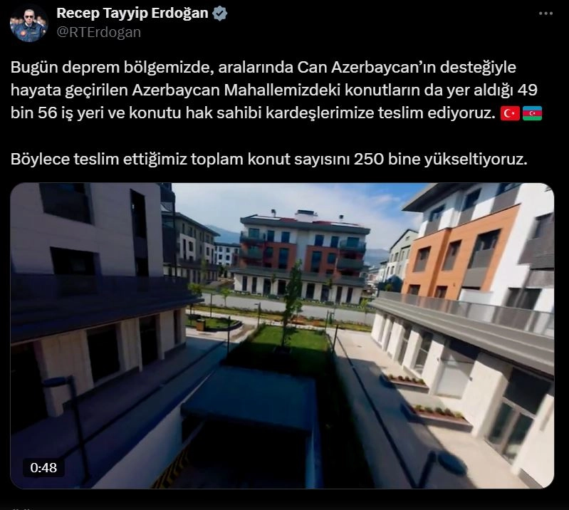 ANKARA, (DHA)- CUMHURBAŞKANI Recep Tayyip Erdoğan, "Bugün deprem bölgemizde, aralarında Can Azerbaycan’ın desteğiyle hayata geçirilen Azerbaycan Mahallemizdeki konutların da yer aldığı 49 bin 56 iş yeri ve konutu hak sahibi kardeşlerimize teslim ediyoruz" dedi. Cumhurbaşkanı Erdoğan, sosyal medya hesabından yaptığı açıklamada, "Bugün deprem bölgemizde, aralarında Can Azerbaycan’ın desteğiyle hayata geçirilen Azerbaycan Mahallemizdeki konutların da yer aldığı 49 bin 56 iş yeri ve konutu hak sahibi kardeşlerimize teslim ediyoruz. Böylece teslim ettiğimiz toplam konut sayısını 250 bine yükseltiyoruz" dedi. (DHA)FOTOĞRAFLI