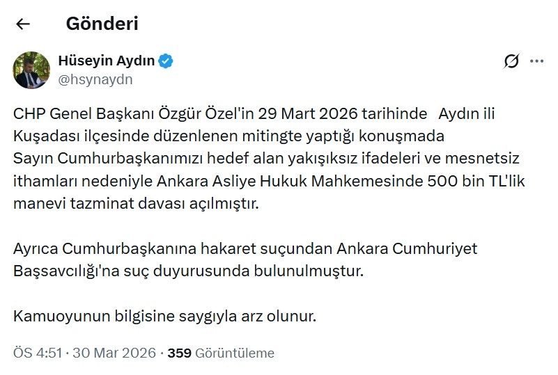 Cumhurbaşkanı Erdoğan'ın avukatı Hüseyin Aydın, sanal medya hesabından yaptığı açıklamada, "CHP Genel Başkanı Özgür Özel'in 29 Mart 2026 tarihinde Aydın ili Kuşadası ilçesinde düzenlenen mitingde yaptığı konuşmada Sayın Cumhurbaşkanımızı hedef alan yakışıksız ifadeleri ve mesnetsiz ithamları nedeniyle Ankara Asliye Hukuk Mahkemesinde 500 bin TL'lik manevi tazminat davası açılmıştır. Ayrıca Cumhurbaşkanı'na hakaret suçundan Ankara Cumhuriyet Başsavcılığı'na suç duyurusunda bulunulmuştur" dedi. (DHA)