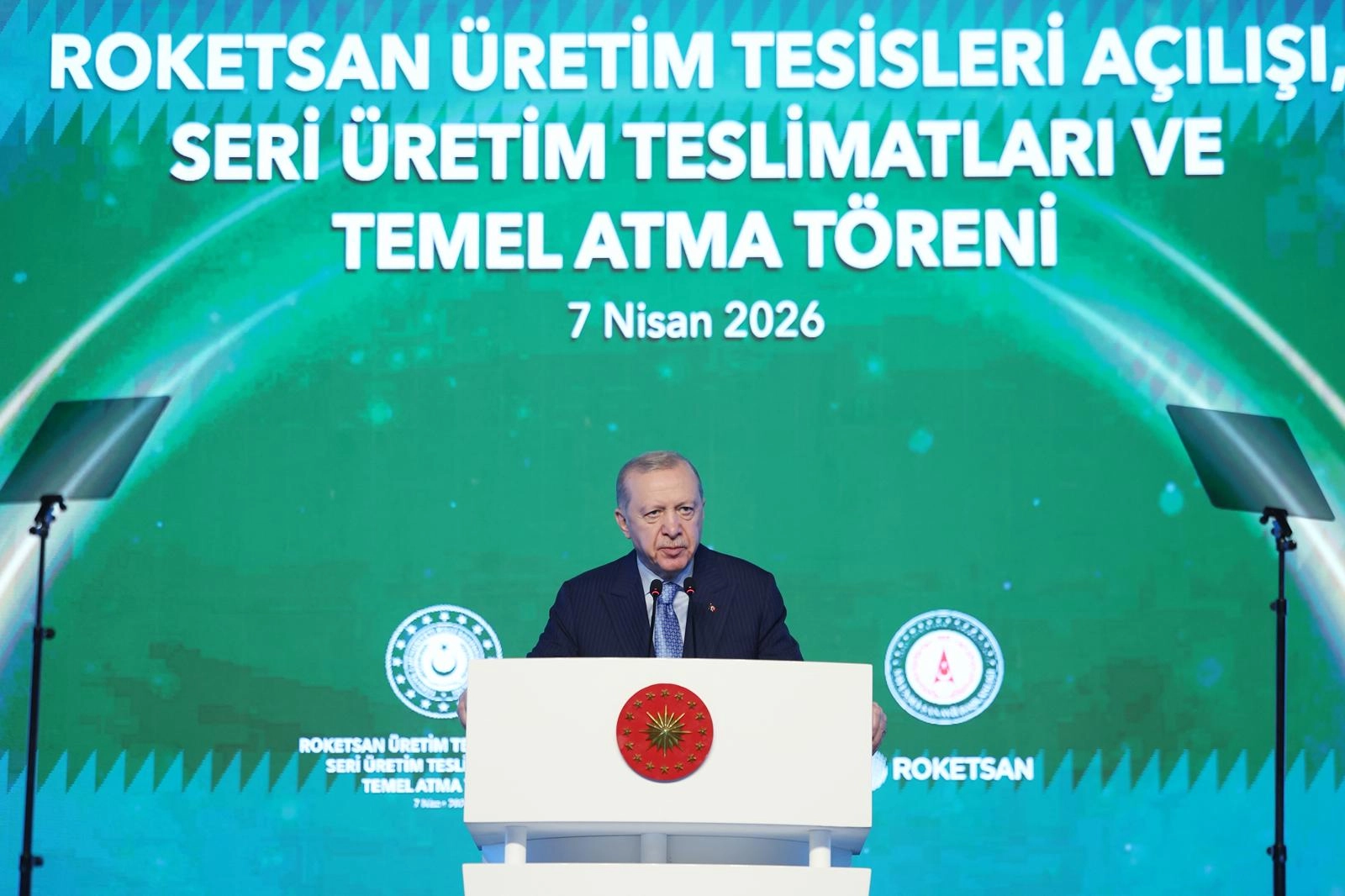 Erdoğan, "Türkiye'nin mühendislik iddiasını, stratejik aklını, yüksek teknoloji vizyonunu temsil eden kurumlarımızdan biri olan ROKETSAN’ımız bu kutlu yürüyüşe çok önemli bir misyonu yerine getiriyor. Geliştirdiği ürünleri bugün 50’nin üzerinde ülkeye ihraç eden ROKETSAN, ülkemizin teknoloji eksenli kalkınmasına çok önemli katkılar yapıyor. ROKETSAN ailemiz 7 bini aşkın çalışanı, yürüttüğü yüzlerce proje ve derin mühendislik birikimiyle 3 binin üzerinde personelle çalışan 4 ar-ge merkezi, milli patent performansı ve yetişmiş insan kaynağı ile savunma sanayimizin yüksek teknoloji karakterini güçlendirmeye devam ediyor. Türkiye olarak uzaya bağımsız erişim hedefimiz doğrultusunda çalışmalarımıza kararlılıkla devam ediyoruz. Roket teknolojilerinden uydu fırlatma kabiliyetlerine varan geniş bir alanda güçlü adımlarla ilerliyoruz. Savunma ile uzayı aynı ufukta buluşturan bu vizyonun hayata geçirilmesinde ROKETSAN’ın çalışmaları inşallah gücümüzü artıracaktır. Sektöre yaptıkları bu kritik katkılardan ötürü ROKETSAN ailemizin tüm mensuplarına şahsım ve milletim adına ayrı ayrı teşekkür ediyorum. KOBİ’lerimizden alt yüklenicilerimize, mühendislerimizden emekçilerimize, bu büyük ekosistemin tüm bileşenlerine şükranlarımı sunuyorum" dedi.