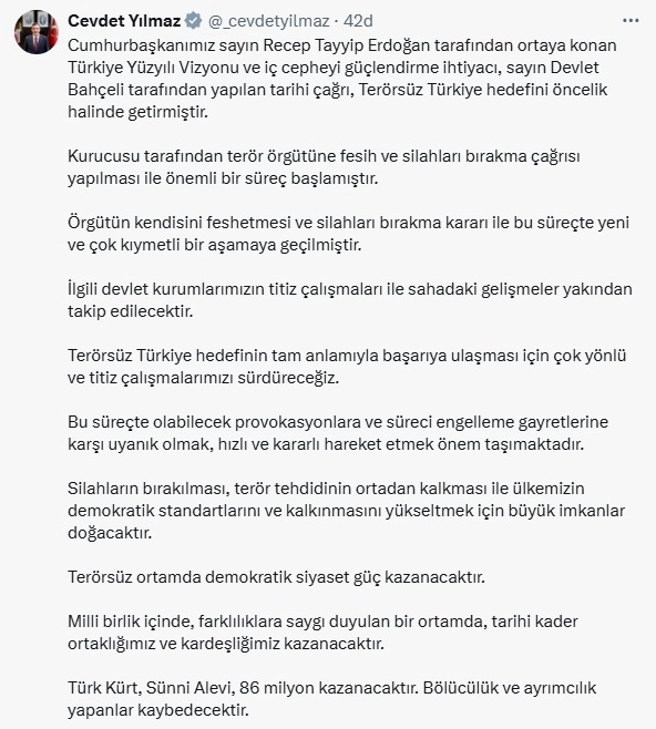 ANKARA, (DHA)- CUMHURBAŞKANI Yardımcısı Cevdet Yılmaz, kurucusu tarafından terör örgütüne fesih ve silahları bırakma çağrısı yapılması ile önemli bir sürecin başladığını, örgütün kendisini feshetmesi ve silahları bırakma kararı ile bu süreçte yeni ve çok kıymetli bir aşamaya geçildiğini belirterek, "Tarihi bir inisiyatif olan Terörsüz Türkiye, dar siyasi hesaplara, popülist söylemlere kurban edilmemelidir" dedi.Cumhurbaşkanı Yardımcısı Cevdet Yılmaz, terör örgütü PKK'nın fesih ve silah bırakma kararına ilişkin sosyal medya hesabından açıklamada bulundu. Yılmaz, Cumhurbaşkanı Recep Tayyip Erdoğan tarafından ortaya konulan Türkiye Yüzyılı vizyonu ile iç cepheyi güçlendirme ihtiyacı ve Devlet Bahçeli tarafından yapılan tarihi çağrının, 'Terörsüz Türkiye' hedefini öncelik haline getirdiğini belirterek, "Kurucusu tarafından terör örgütüne fesih ve silahları bırakma çağrısı yapılması ile önemli bir süreç başlamıştır. Örgütün kendisini feshetmesi ve silahları bırakma kararı ile bu süreçte yeni ve çok kıymetli bir aşamaya geçilmiştir. İlgili devlet kurumlarımızın titiz çalışmaları ile sahadaki gelişmeler yakından takip edilecektir. Terörsüz Türkiye hedefinin tam anlamıyla başarıya ulaşması için çok yönlü ve titiz çalışmalarımızı sürdüreceğiz. Bu süreçte olabilecek provokasyonlara ve süreci engelleme gayretlerine karşı uyanık olmak, hızlı ve kararlı hareket etmek önem taşımaktadır. Silahların bırakılması, terör tehdidinin ortadan kalkması ile ülkemizin demokratik standartlarını ve kalkınmasını yükseltmek için büyük imkanlar doğacaktır" ifadelerini kullandı.'BÖLÜCÜLÜK VE AYRIMCILIK YAPANLAR KAYBEDECEKTİR'Yılmaz, terörsüz ortamda demokratik siyasetin güç kazanacağını belirterek, "Milli birlik içinde, farklılıklara saygı duyulan bir ortamda, tarihi kader ortaklığımız ve kardeşliğimiz kazanacaktır. Türk- Kürt, Sünni- Alevi, 86 milyon kazanacaktır. Bölücülük ve ayrımcılık yapanlar kaybedecektir. Sadece ülkemizde değil, bölgemizde de istikrarı güçlendirecek bu süreç, emperyalist tuzakları boşa çıkarırken, güçlü ve büyük Türkiye gerçeğini daha görünür kılacaktır. Ülkemizin bu tarihi döneminde Cumhur İttifakı’nın yanı sıra, Gazi Meclisimizde temsil edilen tüm siyasi görüşlerden partilerin, sivil toplumun desteği de önem taşımaktadır. Bu vesile ile terörle mücadelede en büyük fedakarlığı yapan aziz şehitlerimizi rahmetle anıyor; gazilerimizi, şehit ve gazi yakınlarımıza şükranlarımızı sunuyoruz. Keşke rahmetli Sırrı Süreyya Önder de büyük emek ve katkı verdiği bu sürecin geldiği bu aşamayı görebilseydi. Tarihi bir inisiyatif olan Terörsüz Türkiye, dar siyasi hesaplara, popülist söylemlere kurban edilmemelidir" dedi. (DHA)
