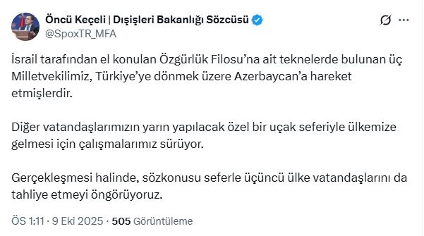 MİLLETVEKİLLERİ, AZERBAYCAN'A HAREKET ETTİDışişleri Bakanlığı Sözcüsü Öncü Keçeli, İsrail tarafından alıkonulan Özgürlük Filosu'na ait teknelerde bulunan Yeni Yol Partisi milletvekilleri Necmettin Çalışkan, Sema Silkin Ün ve Mehmet Atmaca'nın, Türkiye'ye dönmek üzere Azerbaycan'a hareket ettiklerini açıkladı. Keçeli, sosyal medya hesabından yaptığı açıklamada, "İsrail tarafından el konulan Özgürlük Filosu'na ait teknelerde bulunan üç milletvekilimiz, Türkiye'ye dönmek üzere Azerbaycan'a hareket etmişlerdir. Diğer vatandaşlarımızın yarın yapılacak özel bir uçak seferiyle ülkemize gelmesi için çalışmalarımız sürüyor. Gerçekleşmesi halinde, söz konusu seferle üçüncü ülke vatandaşlarını da tahliye etmeyi öngörüyoruz" dedi. (DHA)