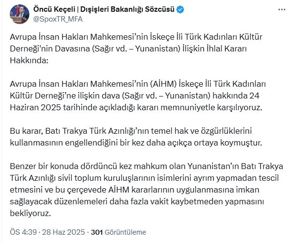 ANKARA, (DHA)- DIŞİŞLERİ Bakanlığı Sözcüsü Öncü Keçeli, Avrupa İnsan Hakları Mahkemesi'nin (AİHM) Batı Trakya Türk azınlığı ile ilgili davada verdiği kararı, memnuniyetle karşıladıklarını açıkladı. Dışişleri Bakanlığı Sözcüsü Öncü Keçeli, sosyal medya hesabından yaptığı açıklamada, "Avrupa İnsan Hakları Mahkemesi'nin İskeçe ili Türk Kadınları Kültür Derneği'ne ilişkin dava hakkında 24 Haziran 2025 tarihinde açıkladığı kararı memnuniyetle karşılıyoruz. Bu karar, Batı Trakya Türk azınlığının temel hak ve özgürlüklerini kullanmasının engellendiğini bir kez daha açıkça ortaya koymuştur. Benzer bir konuda dördüncü kez mahkum olan Yunanistan'ın, Batı Trakya Türk azınlığı sivil toplum kuruluşlarının isimlerini ayrım yapmadan tescil etmesini ve bu çerçevede AİHM kararlarının uygulanmasına imkan sağlayacak düzenlemeleri daha fazla vakit kaybetmeden yapmasını bekliyoruz" ifadelerini kullandı. (DHA)