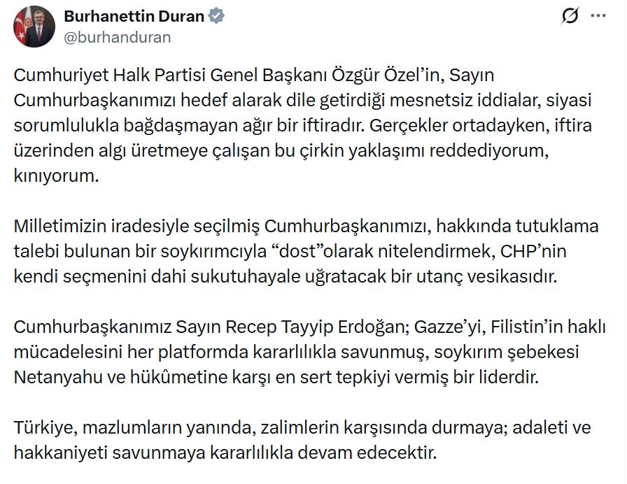 İletişim Başkanı Duran, sanal medya hesabından yaptığı açıklamada, "Cumhuriyet Halk Partisi Genel Başkanı Özgür Özel’in, Sayın Cumhurbaşkanımızı hedef alarak dile getirdiği mesnetsiz iddialar, siyasi sorumlulukla bağdaşmayan ağır bir iftiradır. Gerçekler ortadayken, iftira üzerinden algı üretmeye çalışan bu çirkin yaklaşımı reddediyorum, kınıyorum. Milletimizin iradesiyle seçilmiş Cumhurbaşkanımızı, hakkında tutuklama talebi bulunan bir soykırımcıyla 'dost' olarak nitelendirmek, CHP’nin kendi seçmenini dahi sukutuhayale uğratacak bir utanç vesikasıdır. Cumhurbaşkanımız Sayın Recep Tayyip Erdoğan; Gazze’yi, Filistin’in haklı mücadelesini her platformda kararlılıkla savunmuş, soykırım şebekesi Netanyahu ve hükümetine karşı en sert tepkiyi vermiş bir liderdir. Türkiye, mazlumların yanında, zalimlerin karşısında durmaya; adaleti ve hakkaniyeti savunmaya kararlılıkla devam edecektir" ifadelerini kullandı. (DHA)