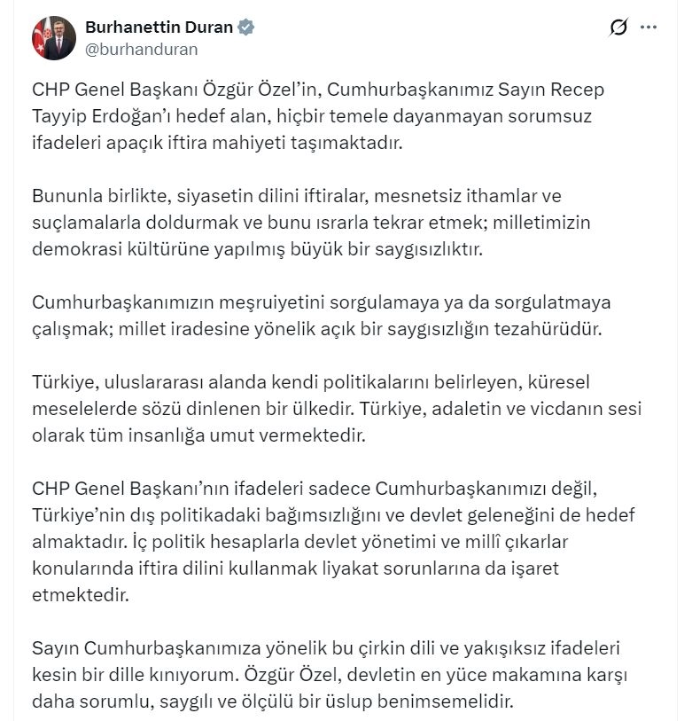 İletişim Başkanı Duran, sanal medya hesabından yaptığı açıklamada, "CHP Genel Başkanı Özgür Özel'in, Cumhurbaşkanımız Sayın Recep Tayyip Erdoğan'ı hedef alan, hiçbir temele dayanmayan sorumsuz ifadeleri apaçık iftira mahiyeti taşımaktadır. Bununla birlikte, siyasetin dilini iftiralar, mesnetsiz ithamlar ve suçlamalarla doldurmak ve bunu ısrarla tekrar etmek; milletimizin demokrasi kültürüne yapılmış büyük bir saygısızlıktır. Cumhurbaşkanımızın meşruiyetini sorgulamaya ya da sorgulatmaya çalışmak; millet iradesine yönelik açık bir saygısızlığın tezahürüdür. Türkiye, uluslararası alanda kendi politikalarını belirleyen, küresel meselelerde sözü dinlenen bir ülkedir. Türkiye, adaletin ve vicdanın sesi olarak tüm insanlığa umut vermektedir. CHP Genel Başkanının ifadeleri sadece Cumhurbaşkanımızı değil, Türkiye'nin dış politikadaki bağımsızlığını ve devlet geleneğini de hedef almaktadır. İç politik hesaplarla devlet yönetimi ve milli çıkarlar konularında iftira dilini kullanmak liyakat sorunlarına da işaret etmektedir. Sayın Cumhurbaşkanımıza yönelik bu çirkin dili ve yakışıksız ifadeleri kesin bir dille kınıyorum. Özgür Özel, devletin en yüce makamına karşı daha sorumlu, saygılı ve ölçülü bir üslup benimsemelidir" dedi. (DHA)
