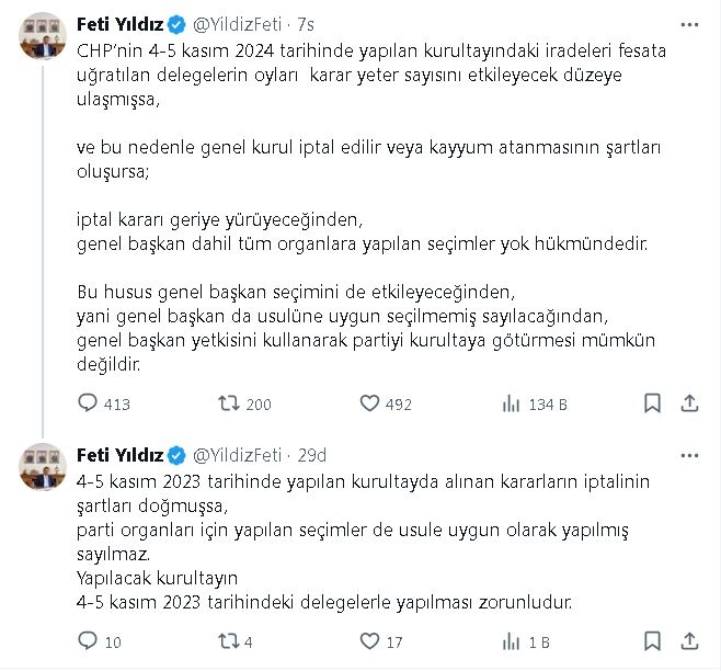 ANKARA, (DHA)- MHP Genel Başkan Yardımcısı Feti Yıldız, CHP'nin olağanüstü kurultay kararına ilişkin, "4-5 Kasım 2023 tarihinde yapılan kurultayda alınan kararların iptalinin şartları doğmuşsa, parti organları için yapılan seçimler de usule uygun olarak yapılmış sayılmaz. Yapılacak kurultayın 4-5 Kasım 2023 tarihindeki delegelerle yapılması zorunludur" dedi.MHP'li Feti Yıldız, CHP Genel Başkanı Özgür Özel'in olağanüstü kurultay kararını açıklamasına ilişkin sosyal medya hesabından yaptığı açıklamada, "CHP'nin 4-5 Kasım 2023 tarihinde yapılan kurultayındaki iradeleri fesata uğratılan delegelerin oyları, karar yeter sayısını etkileyecek düzeye ulaşmışsa ve bu nedenle genel kurul iptal edilir veya kayyım atanmasının şartları oluşursa; iptal kararı geriye yürüyeceğinden, genel başkan dahil tüm organlara yapılan seçimler yok hükmündedir. Bu husus genel başkan seçimini de etkileyeceğinden, yani genel başkan da usulüne uygun seçilmemiş sayılacağından, genel başkan yetkisini kullanarak partiyi kurultaya götürmesi mümkün değildir. 4-5 Kasım 2023 tarihinde yapılan kurultayda alınan kararların iptalinin şartları doğmuşsa, parti organları için yapılan seçimler de usule uygun olarak yapılmış sayılmaz. Yapılacak kurultayın 4-5 Kasım 2023 tarihindeki delegelerle yapılması zorunludur" ifadelerini kullandı. (DHA)
