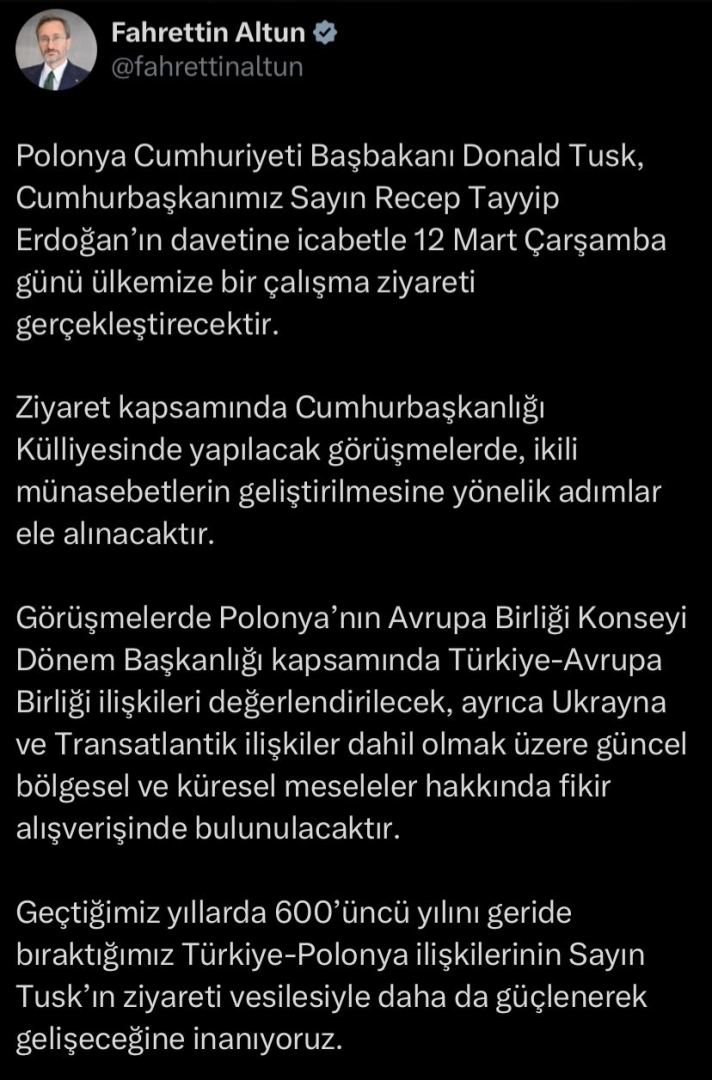 Aybala MELEK/ANKARA, (DHA)- İLETİŞİM Başkanı Fahrettin Altun, Polonya Cumhuriyeti Başbakanı Donald Tusk'ın, yarın Ankara'ya geleceğini açıkladı.İletişim Başkanı Fahrettin Altun, sosyal medya hesabından yaptığı açıklamada, "Polonya Cumhuriyeti Başbakanı Donald Tusk, Cumhurbaşkanımız Sayın Recep Tayyip Erdoğan'ın davetine icabetle 12 Mart Çarşamba günü ülkemize bir çalışma ziyareti gerçekleştirecektir. Ziyaret kapsamında Cumhurbaşkanlığı Külliyesi'nde yapılacak görüşmelerde, ikili münasebetlerin geliştirilmesine yönelik adımlar ele alınacaktır. Görüşmelerde Polonya'nın Avrupa Birliği Konseyi Dönem Başkanlığı kapsamında Türkiye-Avrupa Birliği ilişkileri değerlendirilecek, ayrıca Ukrayna ve transatlantik ilişkiler dahil olmak üzere güncel bölgesel ve küresel meseleler hakkında fikir alışverişinde bulunulacaktır. Geçtiğimiz yıllarda 600'üncü yılını geride bıraktığımız Türkiye-Polonya ilişkilerinin Sayın Tusk'ın ziyareti vesilesiyle daha da güçlenerek gelişeceğine inanıyoruz" ifadelerini kullandı. (DHA)