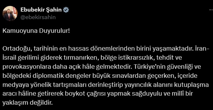 ANKARA, (DHA)- RADYO ve Televizyon Üst Kurulu (RTÜK) Başkanı Ebubekir Şahin, "Böylesine kırılgan bir dönemde, ana muhalefet partisi liderinin ve Cumhuriyet Halk Partisi'nin kanalının, Türkiye'nin köklü ve geniş izleyici kitlesine sahip yayın kuruluşlarını hedef alarak, kime ve neye hizmet ettiği belirsiz, en hafif tabirle aymazlık olarak adlandırılabilecek bir boykot çağrısında bulunmasını şiddetle kınıyoruz" dedi.RTÜK Başkanı Şahin, sosyal medya hesabından yaptığı paylaşımda, Orta Doğu'nun tarihin en hassas dönemlerinden birini yaşamakta olduğunu belirterek, "İran-İsrail gerilimi giderek tırmanırken, bölge istikrarsızlık, tehdit ve provokasyonlara daha açık hale gelmektedir. Türkiye'nin güvenliği ve bölgedeki diplomatik dengeler büyük sınavlardan geçerken, içeride medyaya yönelik tartışmaları derinleştirip yayıncılık alanını kutuplaşma aracı haline getirerek boykot çağrısı yapmak, sağduyulu ve milli bir yaklaşım değildir. Böylesine kırılgan bir dönemde, ana muhalefet partisi liderinin ve Cumhuriyet Halk Partisi'nin kanalının, Türkiye'nin köklü ve geniş izleyici kitlesine sahip yayın kuruluşlarını hedef alarak, kime ve neye hizmet ettiği belirsiz, en hafif tabirle aymazlık olarak adlandırılabilecek bir boykot çağrısında bulunmasını şiddetle kınıyoruz" dedi. 'AMACIMIZ, HALKIN GÜVENİLİR BİLGİYE ERİŞİMİNİ TEMİN ETMEK'Bu tutumun, toplumda gereksiz gerilim ve ayrışmalara neden olduğunu, basın özgürlüğü ile halkın haber alma hakkına ciddi zararlar verdiğini kaydeden Şahin, şunları söyledi: "Medyayı sistemli biçimde hedef haline getiren bu tür siyasi çıkışlar, halkın farklı kaynaklardan bilgi edinme hakkını doğrudan zedelemektedir. Elbette eleştiriler, demokratik hayatın doğal ve vazgeçilmez bir parçasıdır. Ancak bu eleştirilerin kurumları doğrudan hedef göstermeye dönüşmemesi, kamusal tartışmanın sağlıklı ve yapıcı biçimde sürdürülebilmesi açısından büyük önem taşımaktadır. Yayıncılık sektörü; sadece ifade özgürlüğünü savunmakla kalmaz, aynı zamanda toplumsal sorumluluk bilinciyle hareket etmekle yükümlüdür. Radyo ve Televizyon Üst Kurulu olarak biz, yayınların hukuka ve etik kurallara uygunluğunu titizlikle denetliyor; ihlal tespit edildiğinde yasal çerçevede gerekli müdahaleleri kararlılıkla gerçekleştiriyoruz. Amacımız, medya sektöründe özgürlük ile sorumluluk arasındaki dengeyi koruyarak, halkın doğru ve güvenilir bilgiye erişimini temin etmektir. Bu hassas dengeye katkı sağlamak ve toplumsal barışın güçlenmesi için siyaset kurumunun da üzerine düşen sorumluluğu yerine getirmesi gerekmektedir. Özellikle böyle zamanlarda, medyayı hedef göstermek yerine; birleştirici, uzlaştırıcı ve sorumlu bir dil benimsemek herkesin ortak görevidir. Türkiye’nin köklü yayın kuruluşları görevlerini hukuka, etik ilkelere ve kamu yararına uygun şekilde sürdürmeye devam ederken; Üst Kurul olarak bu süreci büyük bir kararlılık ve hassasiyetle takip etmeyi sürdüreceğiz." (DHA)
